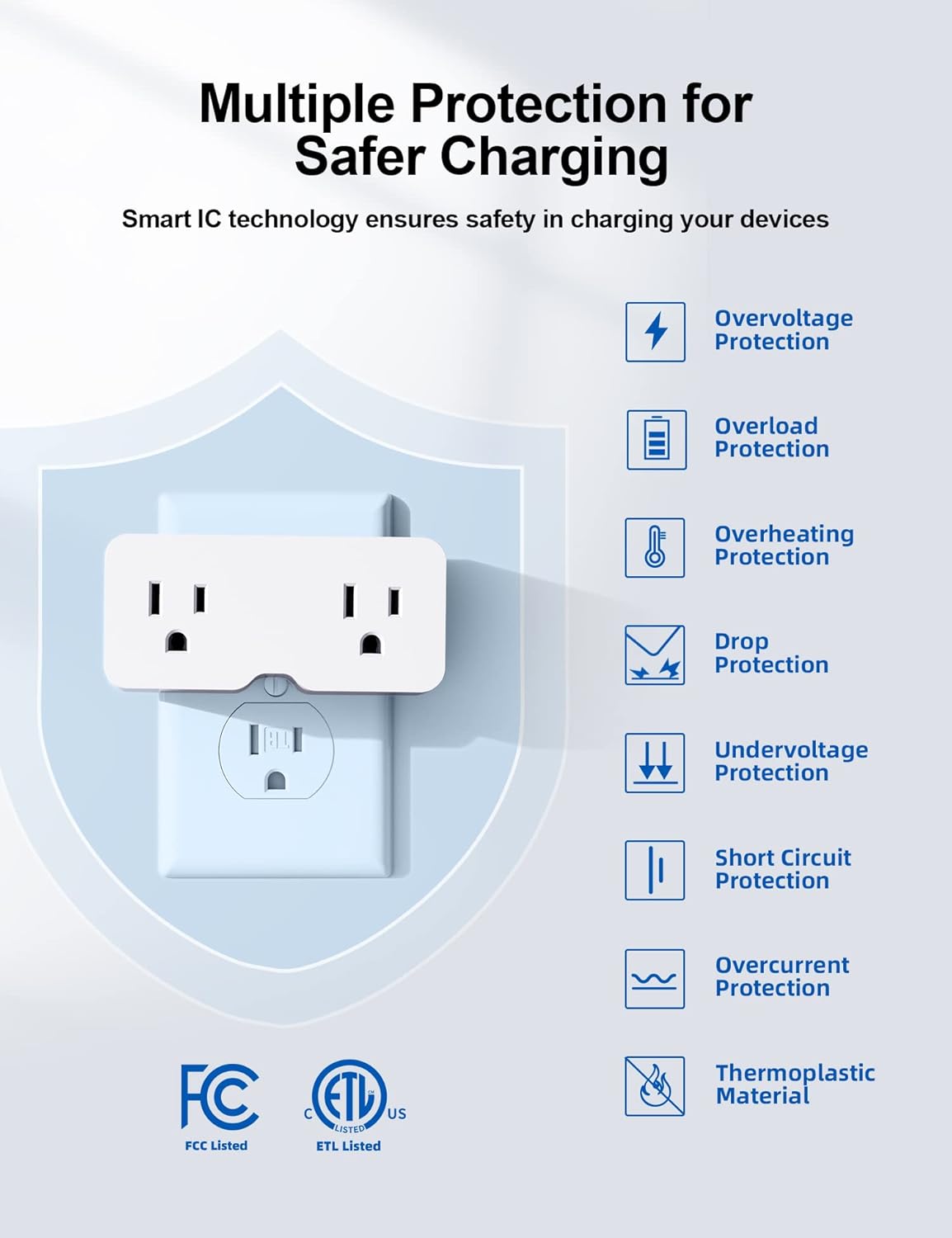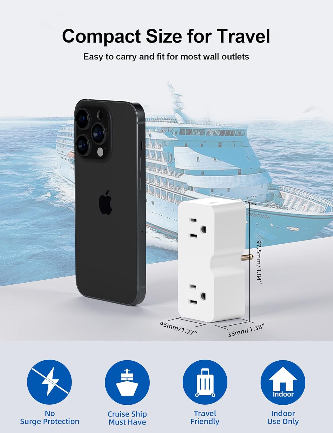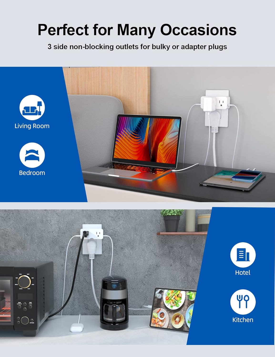 ✅ 【Convert One Outlet to Two Outlets】 This 3 prong plug splitter only occupies one single AC outlet on your wall socket, saving bottom space to use another plug; It converts a single outlet into two outlets without blocking. Powering up to 4 devices at the same time is available.