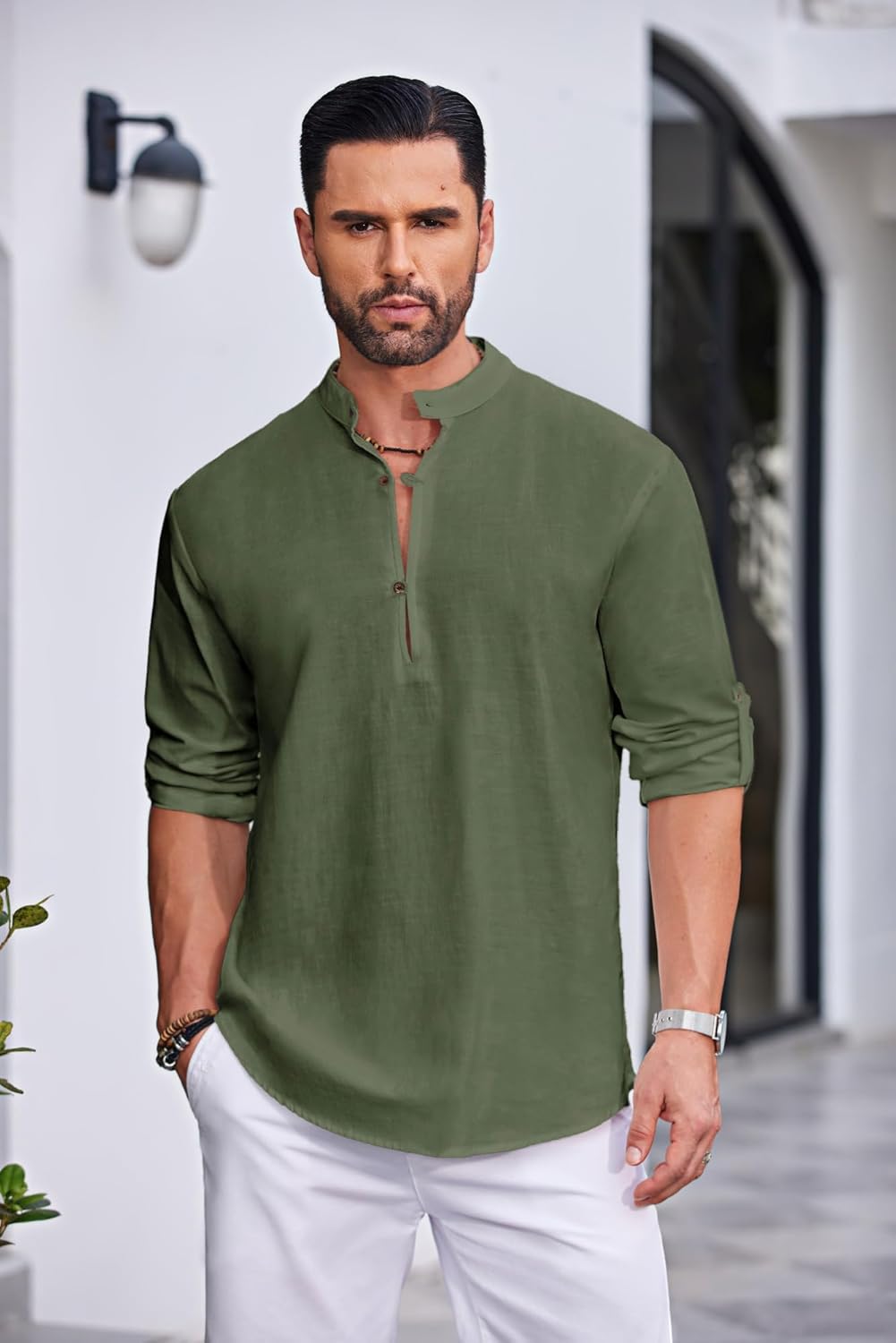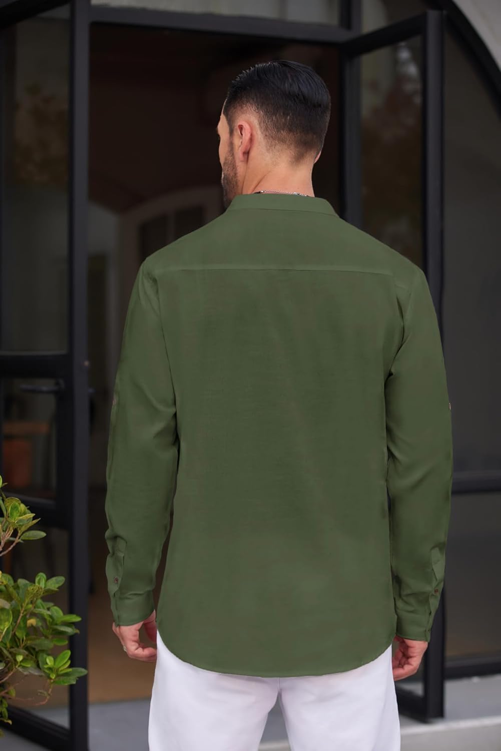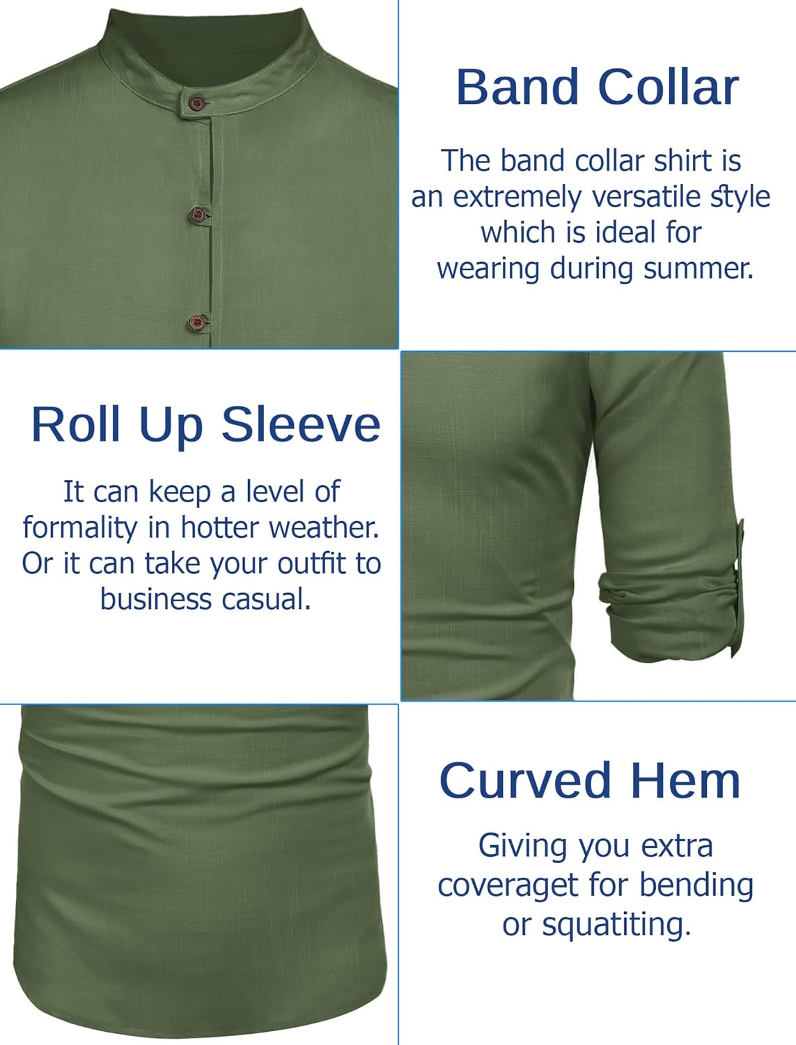 【FEATURE】Casual mens linen shirt, has a stand collar, solid color, slim fit, long sleeve(Roll-up), button placket.