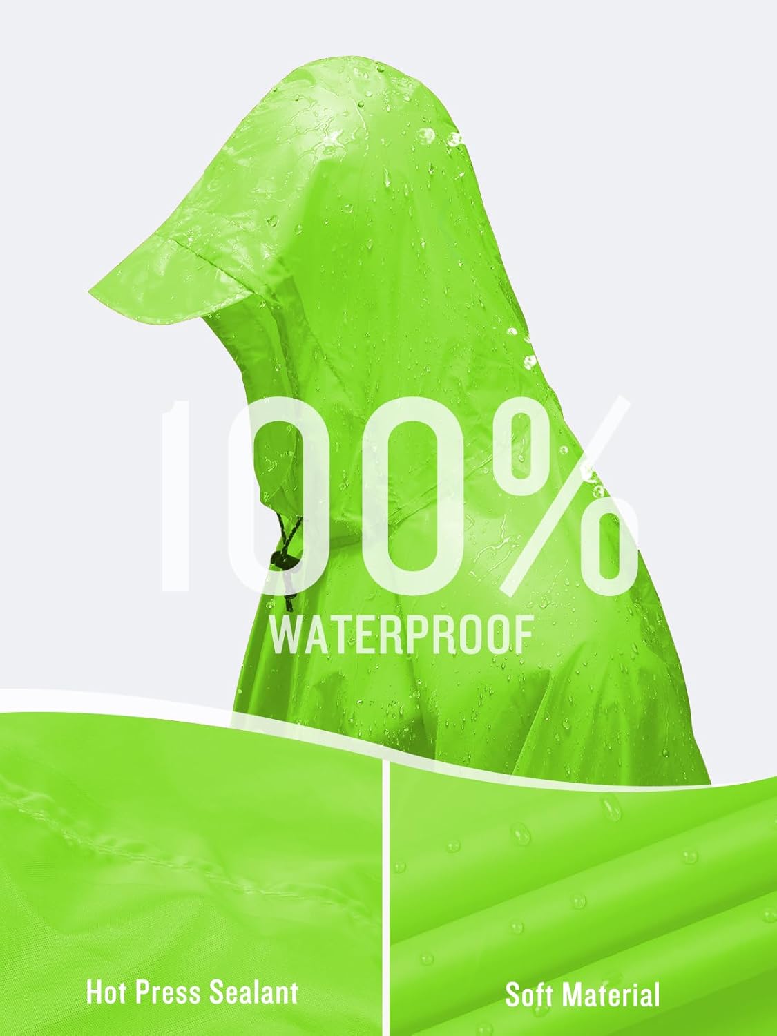 [Material & Waterproof Function]: Crafted from 100% Polyester with a strong waterproof backing featuring heat-sealed seams, this poncho is also windproof. It utilizes high-density polyester and a PU 5000MM waterproof coating to resist water, sand, and wind. All seams are caulking treated for durability, keeping you and your belongings dry.