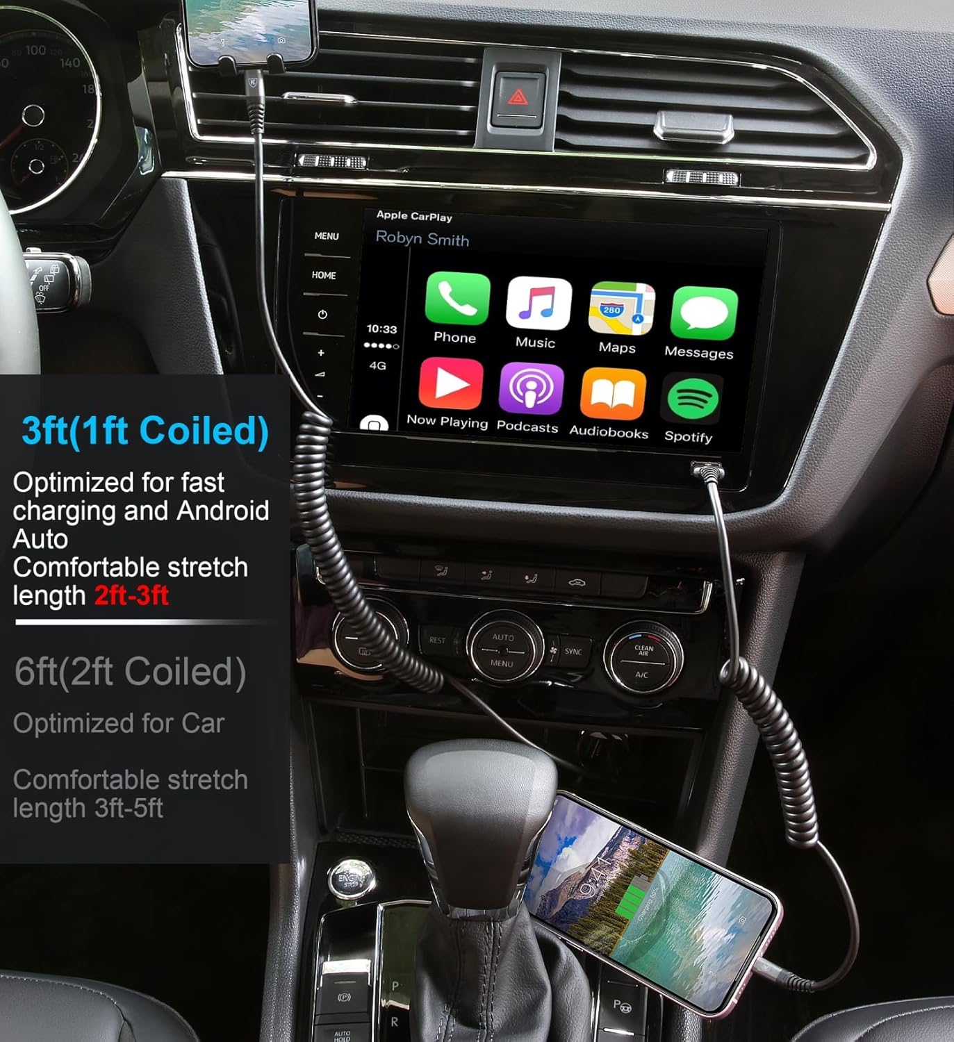 Elastic Coiled Lightning Cable : Coiled lightning cable 3FT (stretchable to 4.8FT, comfortable stetch length 2ft-3ft) coiled lightning cable 6FT (stretchable to 6.5FT, comfortable stetch length 3ft-5ft) and bounce back to normal length. If you use CarPlay and store your iPhone in a cubicle, we recommend using 3ft; if you use your device lying on the couch while you are charging, you can choose 6ft. iPhone charging cable 3ft and 6ft can meet your different needs.