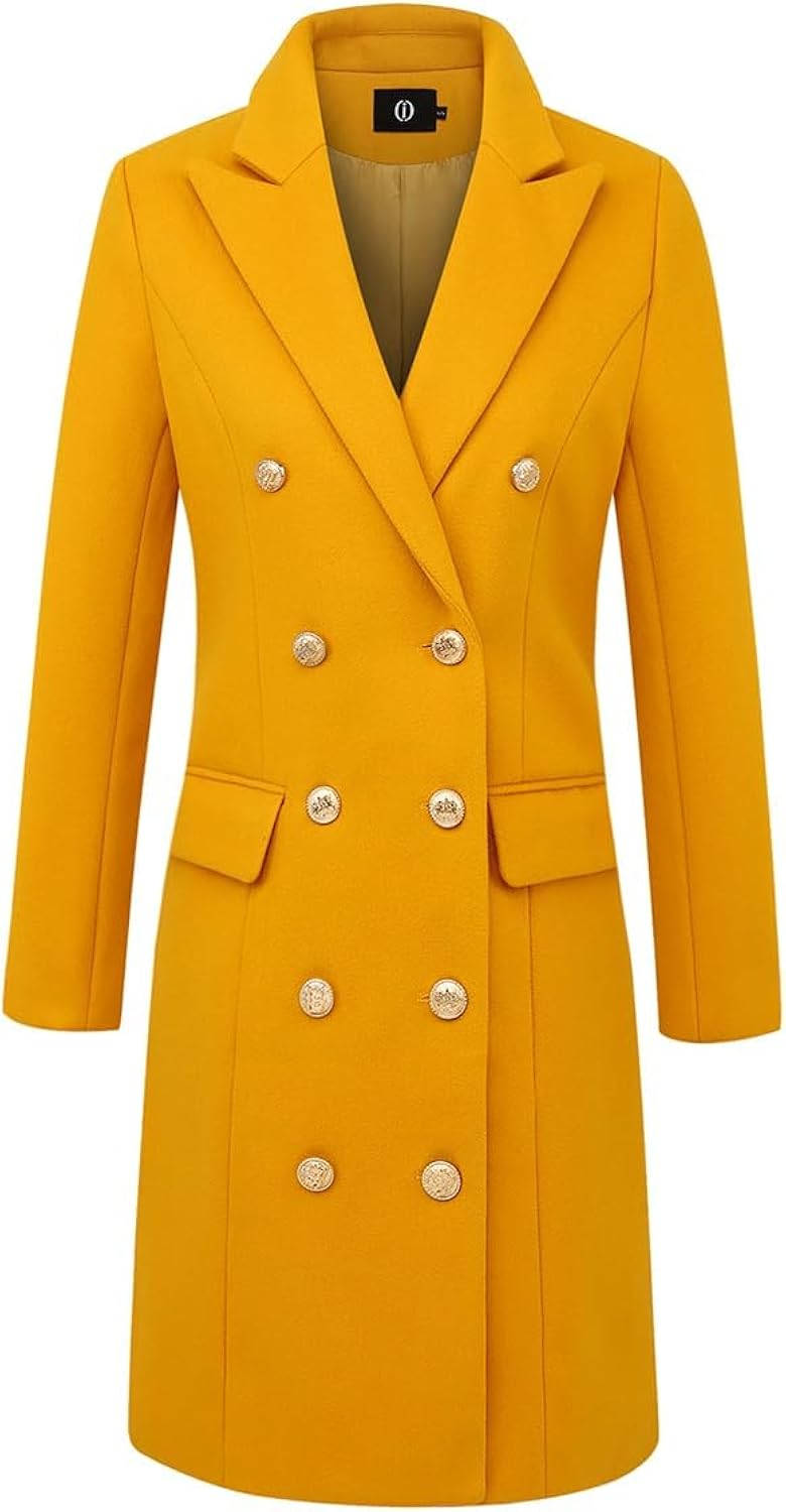 Features: Long sleeve, classic notch lapel collar, double breasted front, side flap pockets, knee length
