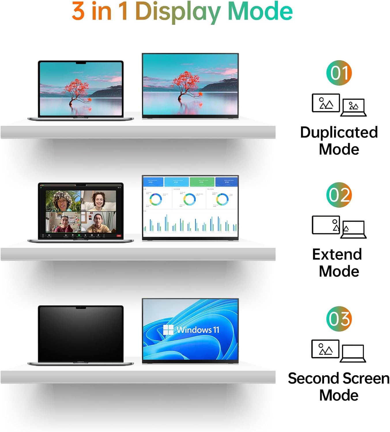 Give consideration to work and games - through multiple display modes [Copy Mode/Extended Mode/Second Screen Mode/Portrait Mode], we can bring you a clear second screen in the meeting, and expand the screen anytime and anywhere to improve work efficiency and improve the quality of life. Adjusting to HDR mode can upgrade the image to a new level, providing you with brighter highlights,deeper and more realistic colors, more realistic images, and amazing viewing/gaming experience.