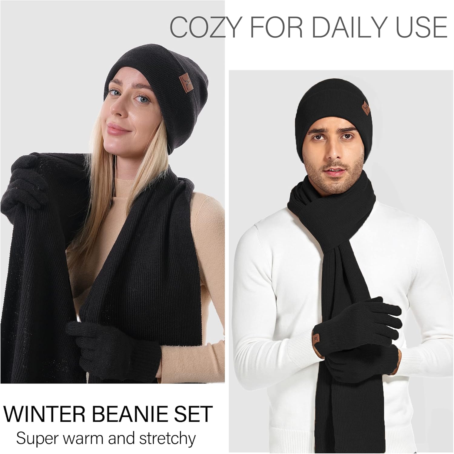 Premium Warm Material: This 3 pieces winter beanie long scarf gloves set is made from 8.6% cashmere+50.7% acrylic fiber+40.7% nylon. Tight weave and thick fabric for wind and warmth. Knitting feel, very soft and cozy, close to the skin, soft and comfortable to wear. The unisex hat scarf and touch-screen gloves set can meet all of your need to keep warm in the spring, autumn and winter.