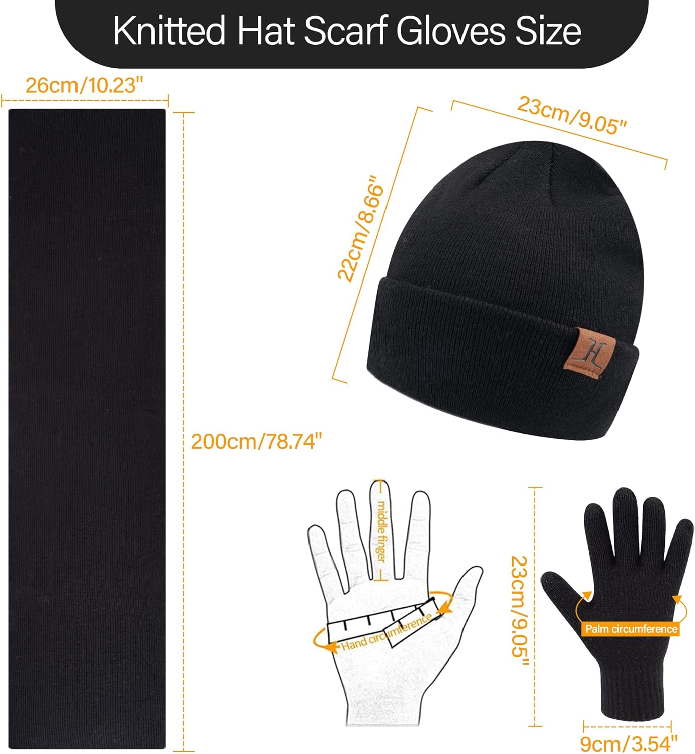 Unisex Beanie Hat Scarf Gloves Suit: Our hat and gloves use stretchable elastic materials so that can adapt to various head shapes and hand sizes, and it's easy to wear or take off. One size fit all: Beanie Hat: 23x21cm/9.05" x 8.26", Long Scarf: 199x26cm/78.34" x 10.23", Touchscreen Gloves: 23x11cm/9.05" x 4.33". Brim of hat with roll-up edge design, you can roll the edges up to reveal the delicate leather tabs, or drop the brim for a slouchy casual look.