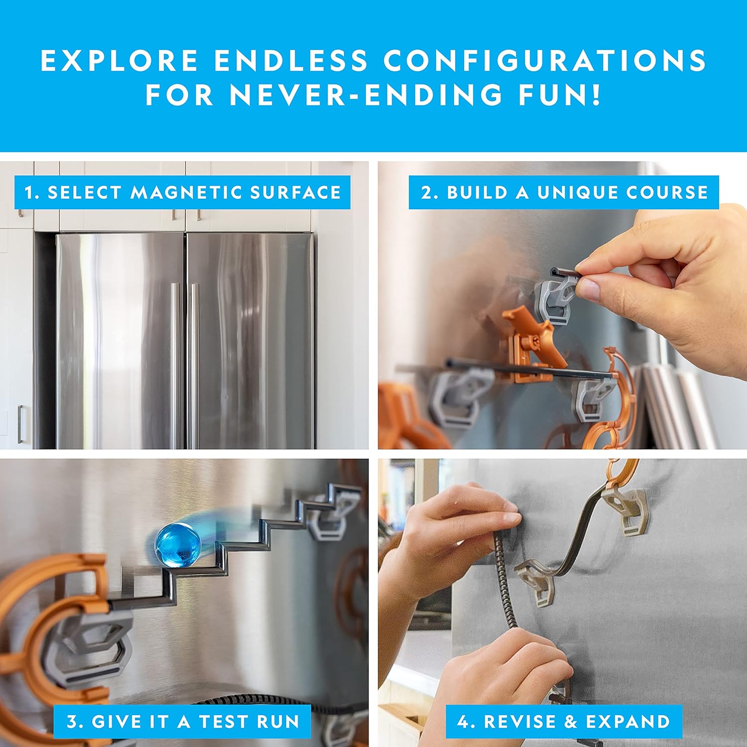 BUILD ANYWHERE MAGNETS STICK - This STEM marble maze for kids and adults can be built on any vertical magnetic surface like the fridge, lockers, whiteboards, workbenches & more!