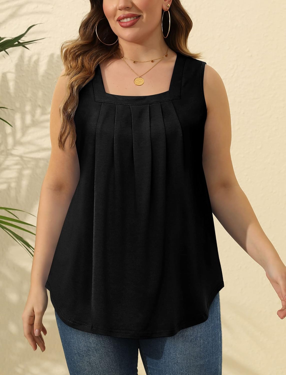 Saloogoe Summer Tank Tops for Women Loose Fit Pleated Square Neck Sleeveless Tops Curved Hem Flowy