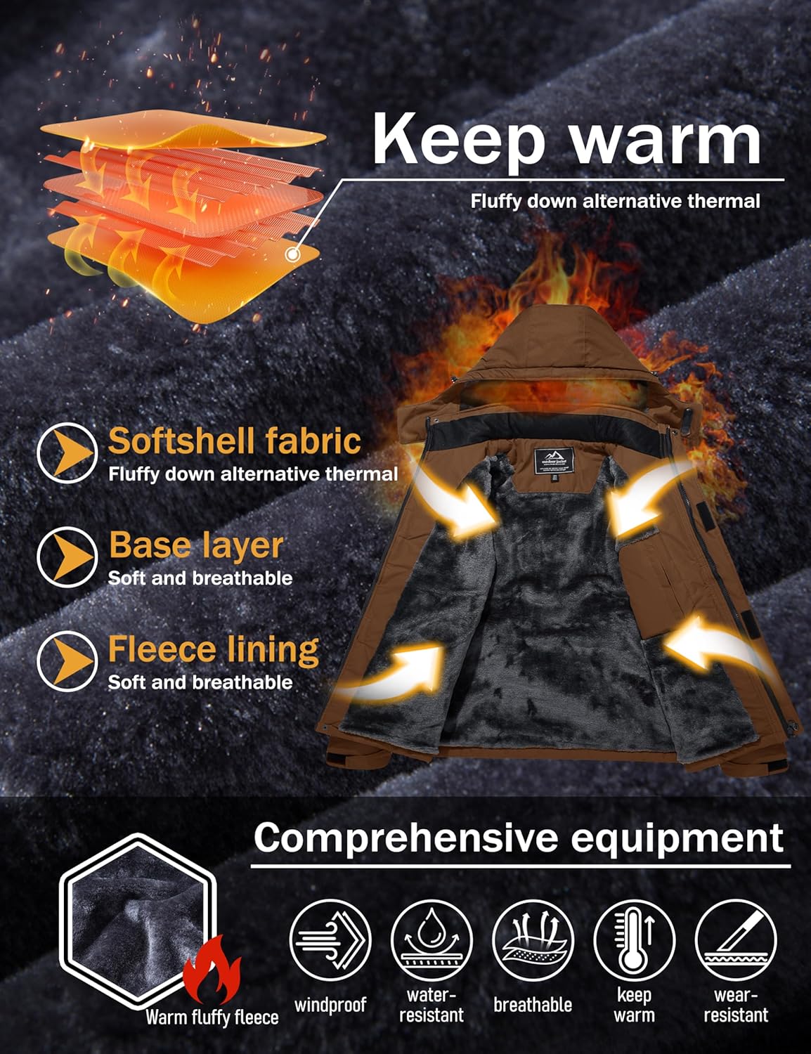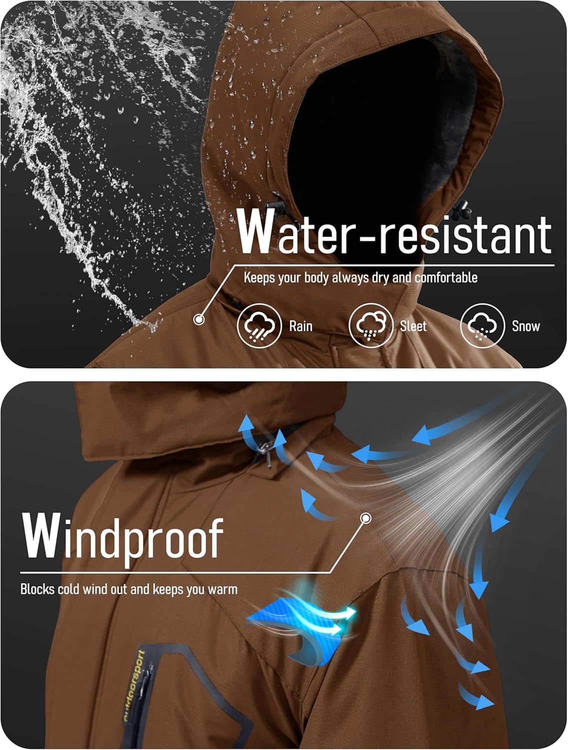 Water Resistant: Professional water resistant jacket, keep your body always dry and comfortable, you won't worry about getting wet while skiing, snowboarding, hunting, hiking in inclement weather