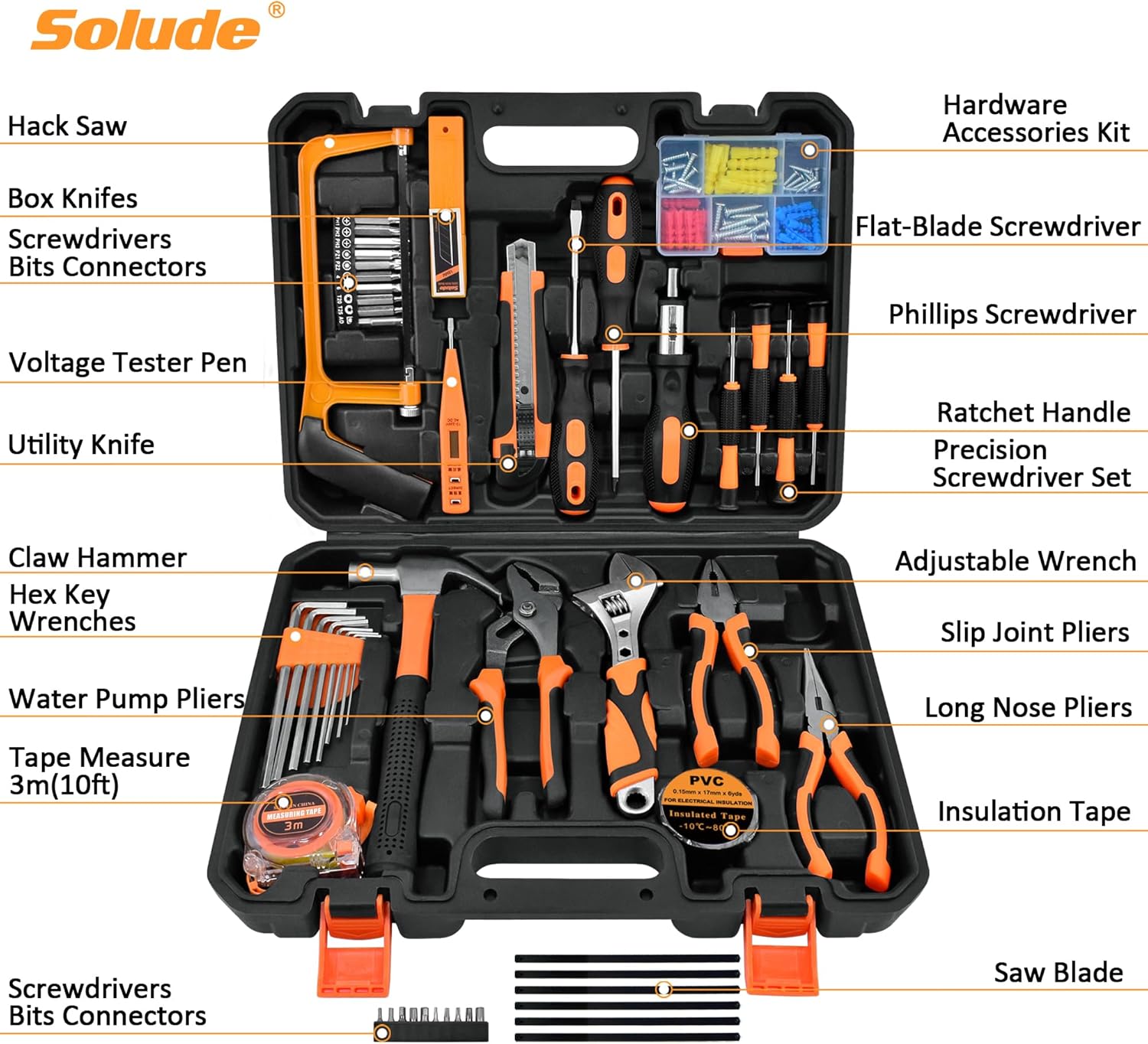 ??【Complete Tool Set for Home】The basic household tool kit contains all of the most necessary household tools for home essentials,maintenance and daily use,includes hacksaw,water pump pliers,adjustable wrench,claw hammer,pliers,ratchet wrench,hex key Allen wrench set,screwdrivers,utility knife,tape measure,voltage tester pen,insulation tape,hardware kits and screwdrivers bits connectors.