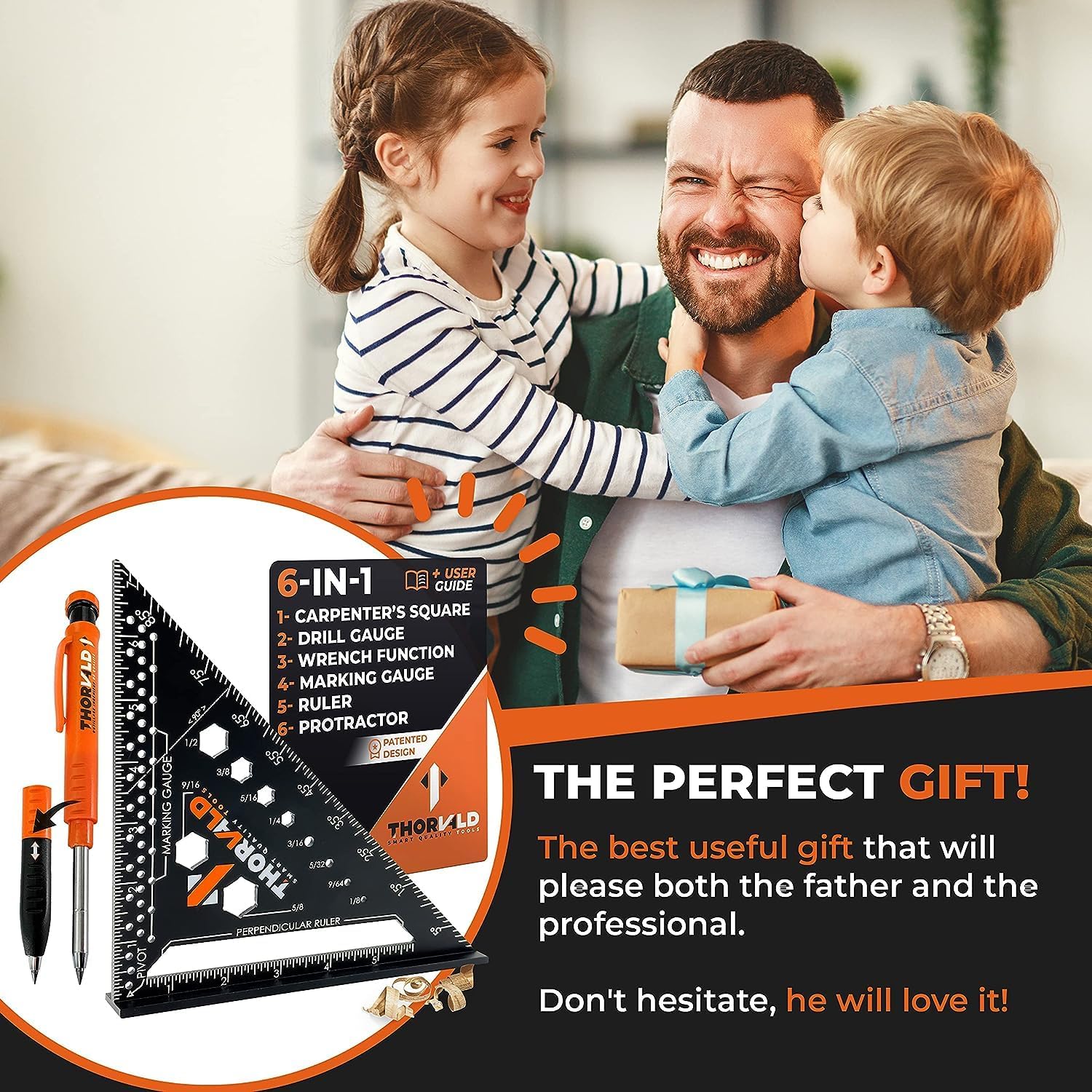 ⚡WORK FASTER & SMARTER - Save precious time on woodworking with our new rafter square. Easily measure, trace, and take angles using only one woodworking square! No need to bring a bulky toolbox. With our 6-in-1 carpenter tools, you have everything you need to work quickly and efficiently!