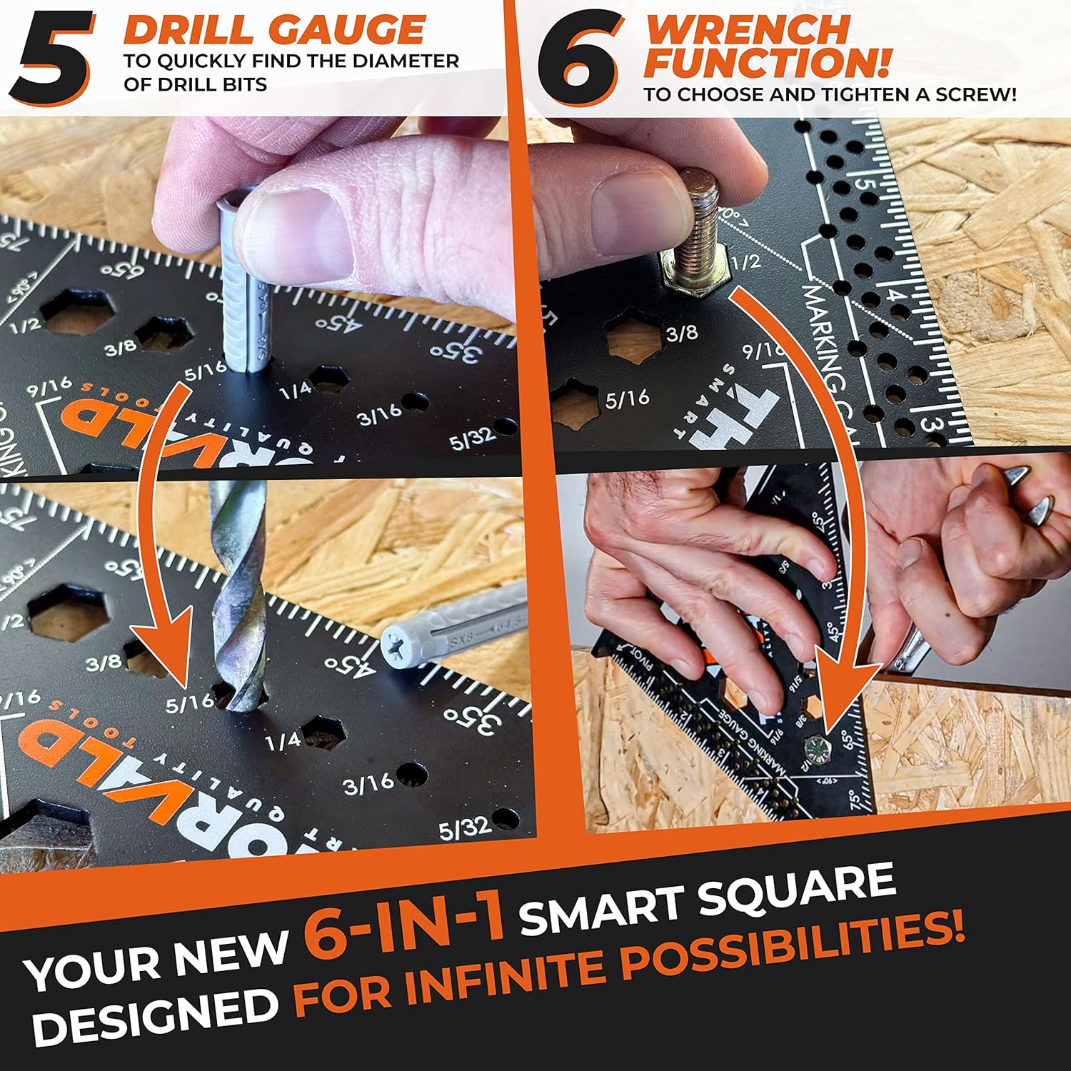 ✅A WHOLE TOOLBOX IN ONE SQUARE - Our new triangle ruler isn't just any ordinary measuring tool. It combines six carpentry tools in one accessory, including a square, two protractors, three marking gauges, two rulers, a drill gauge, and a wrench. Your new all-purpose precision tool!