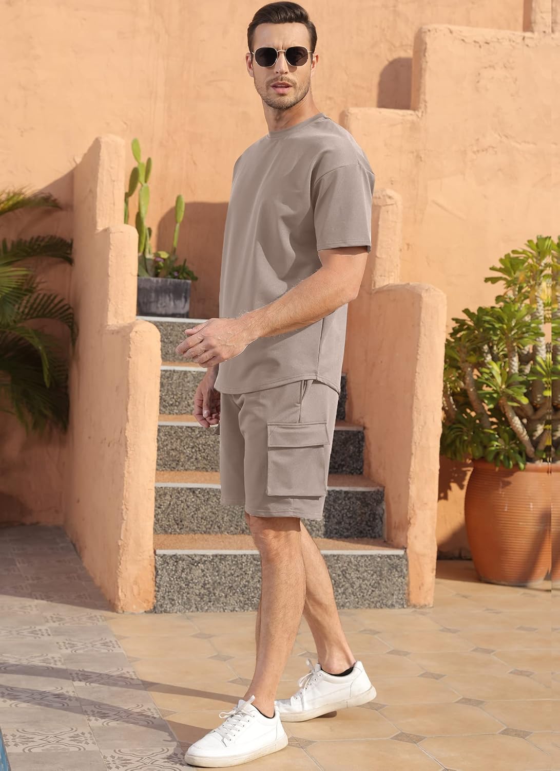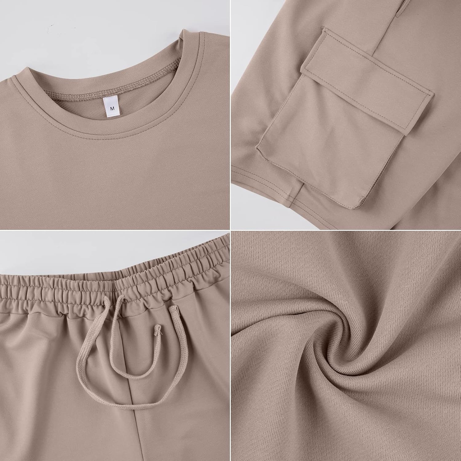 【Design】- Men's sport loose fit outfis-crew neck ,solid color,oversize,fashionable and stylish,the short is featured with double-sided slant pockets,two side pockets and adjustable elastic waist drawstring waist,not just a tracksuit, but also outing suit, men's athletic clothing sets,daily lounge wear.