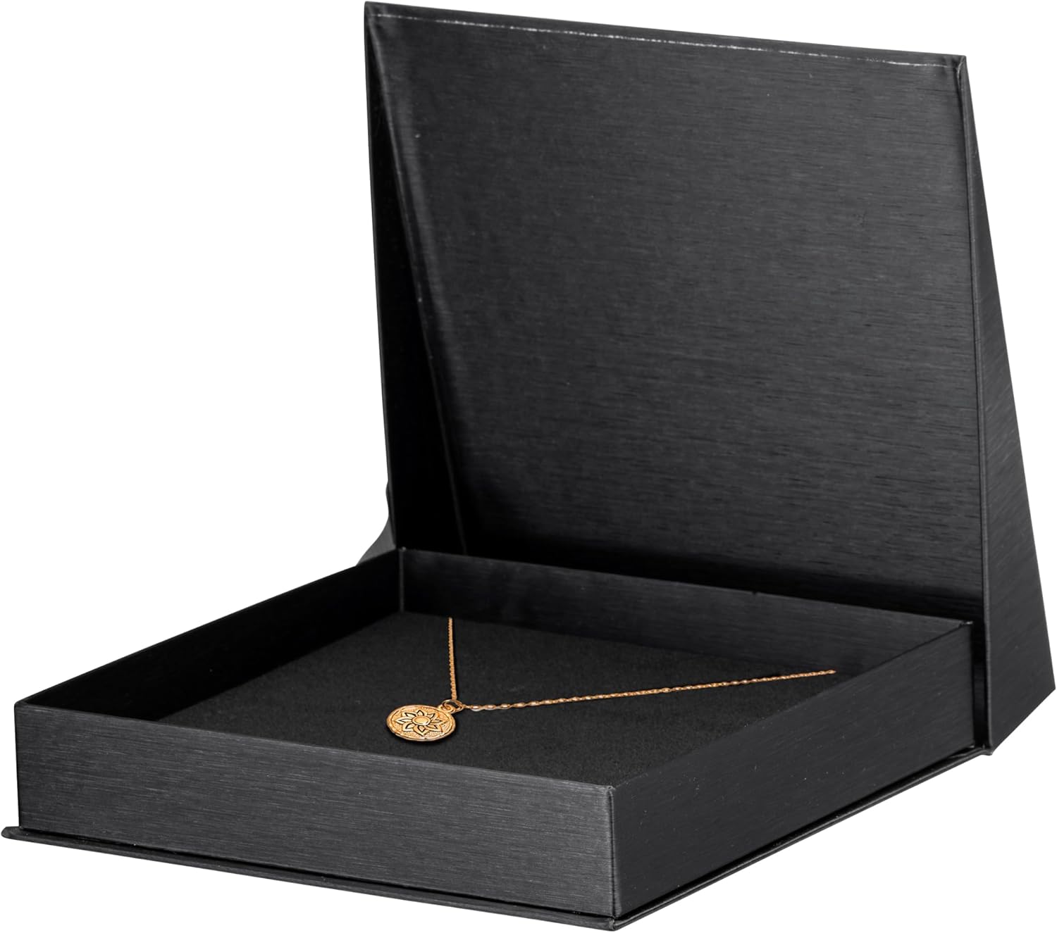 PREMIUM MATERIAL & MODERN DESIGN - Exterior: High-quality black jewelry box with angled top & sheen silk brushed paper cardboard. Interior: Fashioned soft foam covered in black velvet. Insert: Cut foam necklace slot