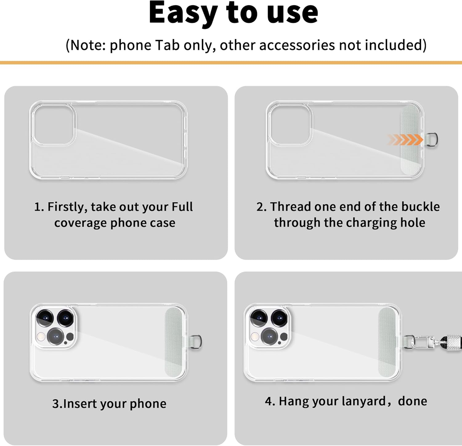 Easy to use: First, thread the phone strap patch through the fully covered charging hole of the phone case, Then, install your phone into the phone case; And the last, fasten your lanyard to the metal buckle of the phone patch