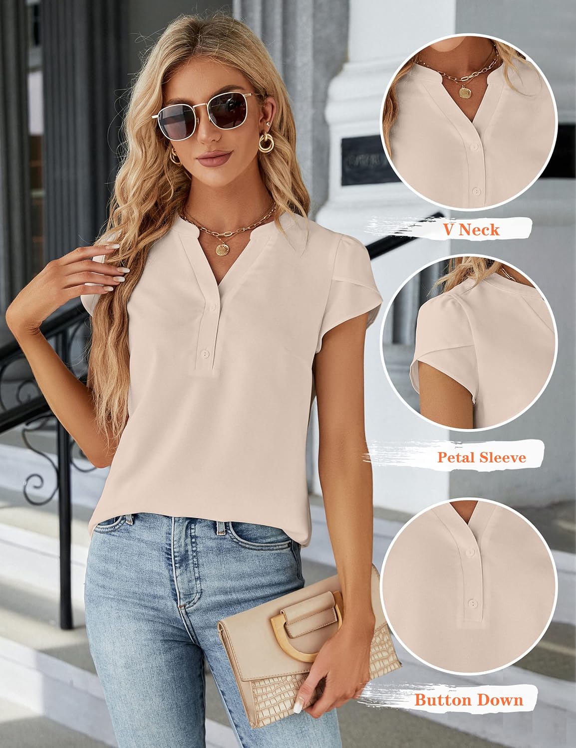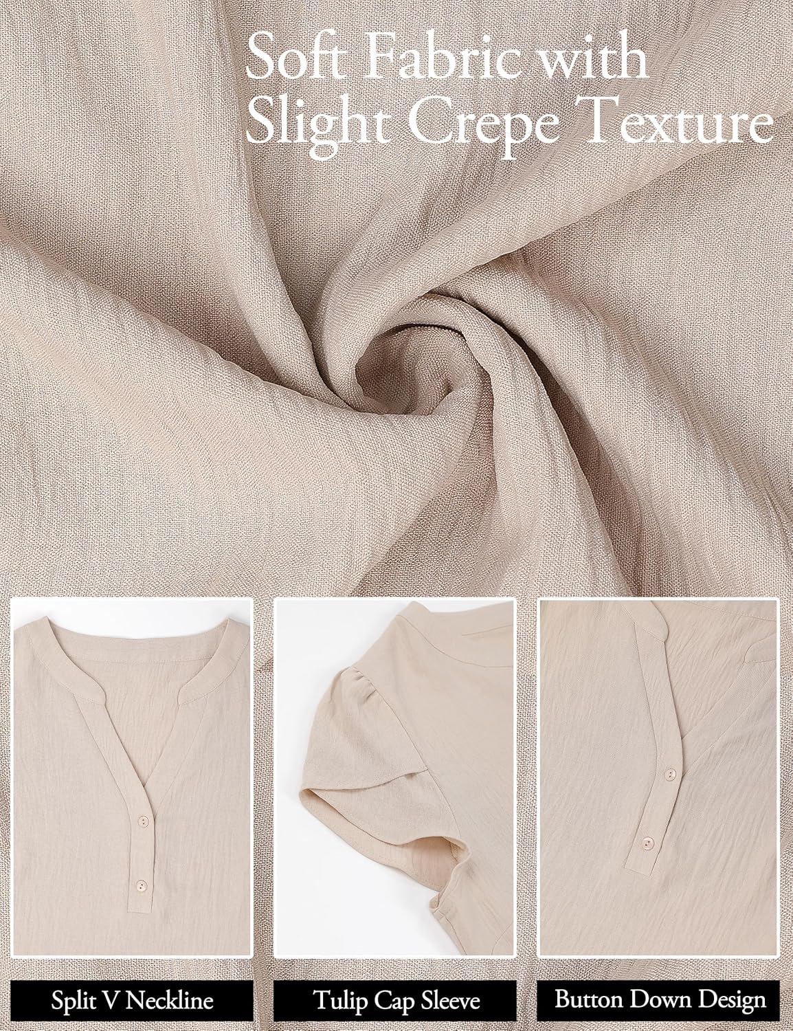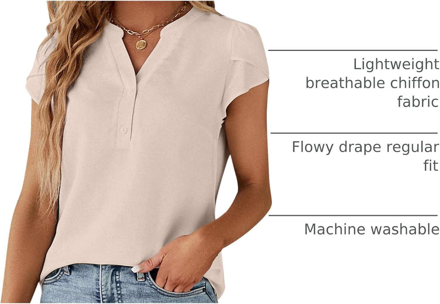 Feature: The dressy tops for women features split v neck, tulip short sleeve, button front, curved hem, solid color, flowy drape, regular fit, cute and elegant style, giving you a charming and trendy looking when you wear it.