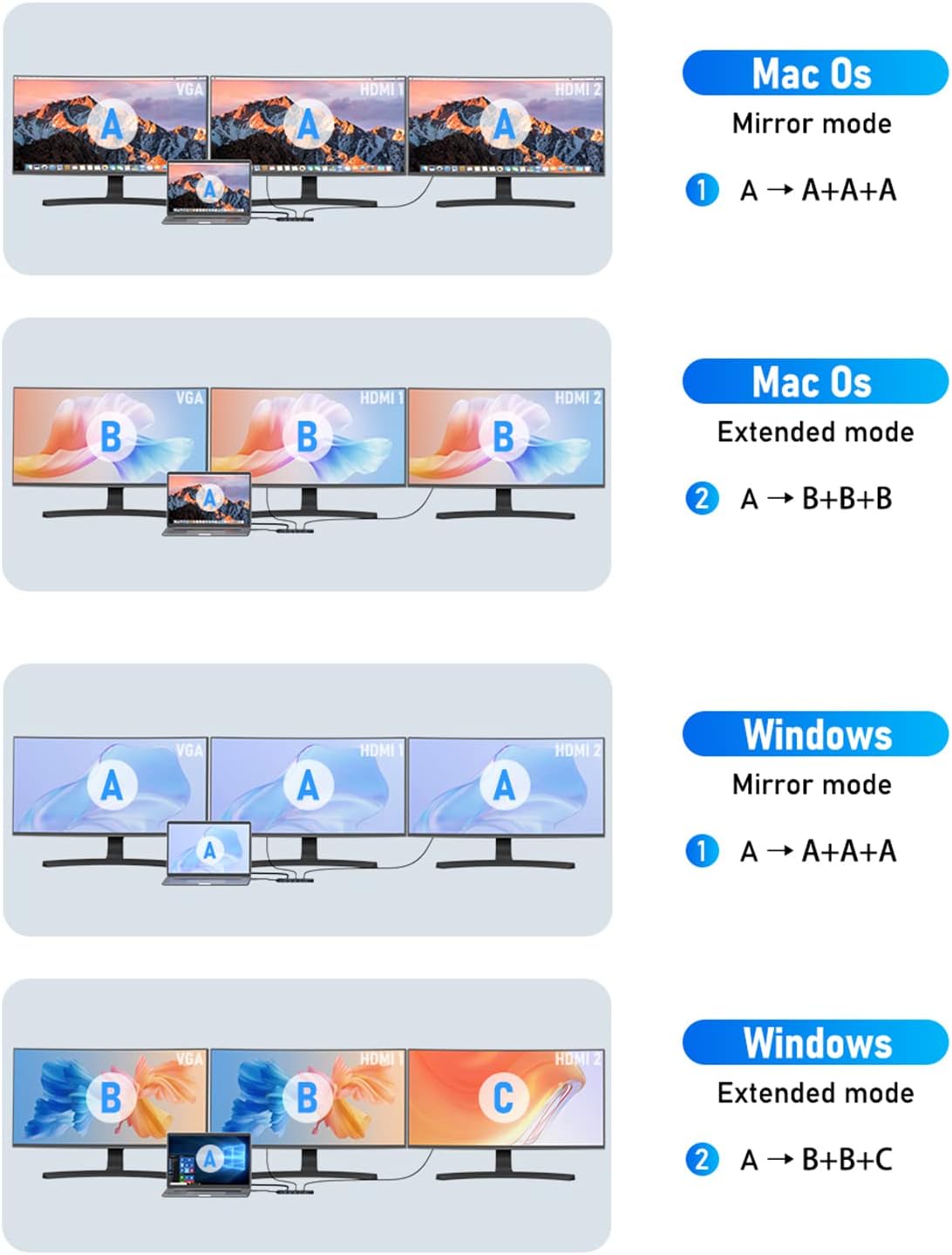 【Docking Station Dual Monitor 2 HDMI&VGA】This usb c dock will help you to easily achieve dual&triple monitor display,meets all your needs and make your work easier;Single use HDMI 1 can up to 4K 30Hz under DP1.4 source; And resolution support up to 4K@30Hz & 2K@60Hz when simultaneously connect dual hdmi;And resolution support up to 1080P for external 3 monitors when triply display under DP1.4 source;Notices:MacOs laptop only support SST mode, so all external monitor screens will be the same.