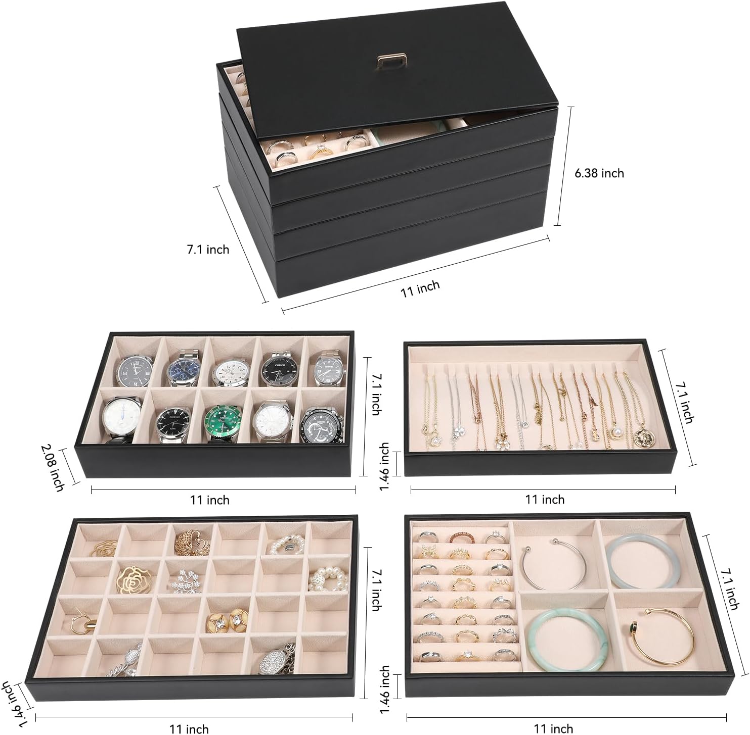 Versatile Tray with Lid: The set of 4 jewelry organizer can be easily split up, combined or stacked to meet your personalized storage needs for men women.Stacks and doesn’t slide, it is a breeze to pack and sit beautifully on your dresser or armoire as a jewelry case, and also can be used as a jewelry drawer inserts. In addition, it is great to display earrings, necklaces, bracelets, rings, brooches, pins, watches in the jewelry store,showcase.
