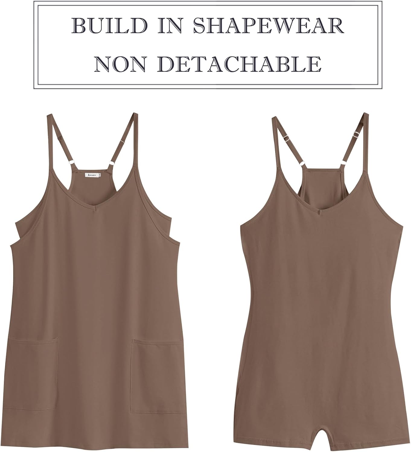 Features - This workout mini dress build in shapewear featured spaghetti straps, V neck, patch pockets, solid color, making it perfect for staying cool and stylish during hot summer days.