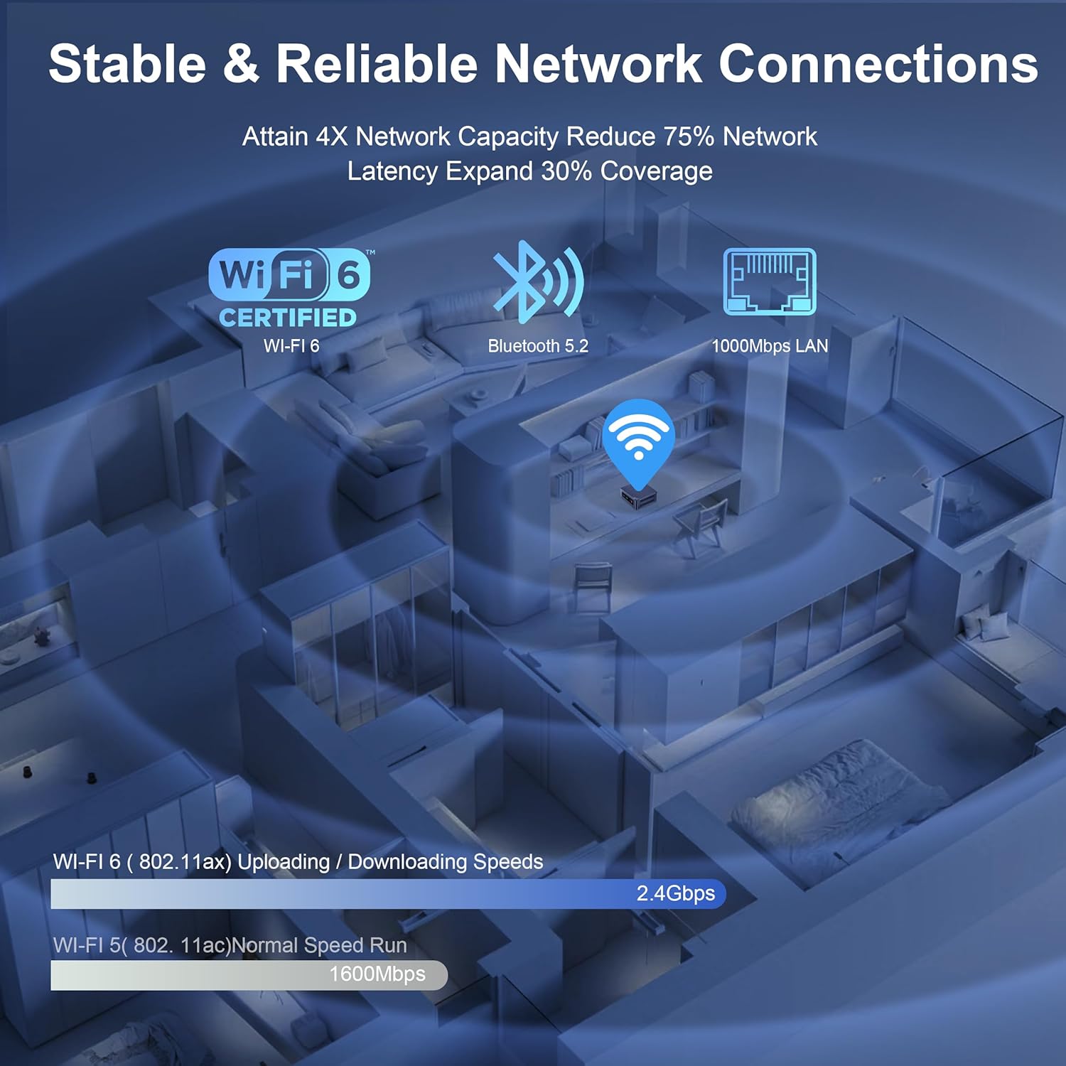 【High-Speed Network】The mini desktop pc supports Wi-Fi 6 (802.11 ax) for ultra-fast wireless connections, enabling smooth streaming and speedy downloads. Compared with Wi-Fi 5, Wi-Fi 6 is nearly 3 times faster, you can have a dedicated and undisturbed channel when playing games. Built-in Bluetooth 5.2 allows for effortless pairing with various peripherals, such as wireless keyboards, mice, earphones, monitoring camera, printer, monitor, TV, projector etc