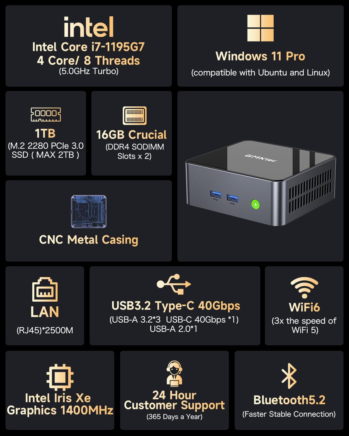 GMKtec M2 Pro mini computer is equipped with 11th generation Intel Core i7-1195G7 processor, main frequency up to 5.0 GHz, 4 cores, 8 threads, 12MB cache, running much faster than i7-10810U, i5-12450H and i5-8259U, Windows PC series The power is only 35W, supporting your daily work with less power consumption, without delaying daily tasks