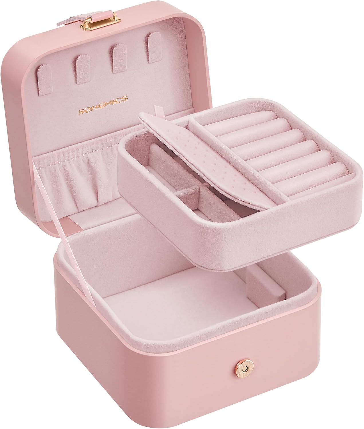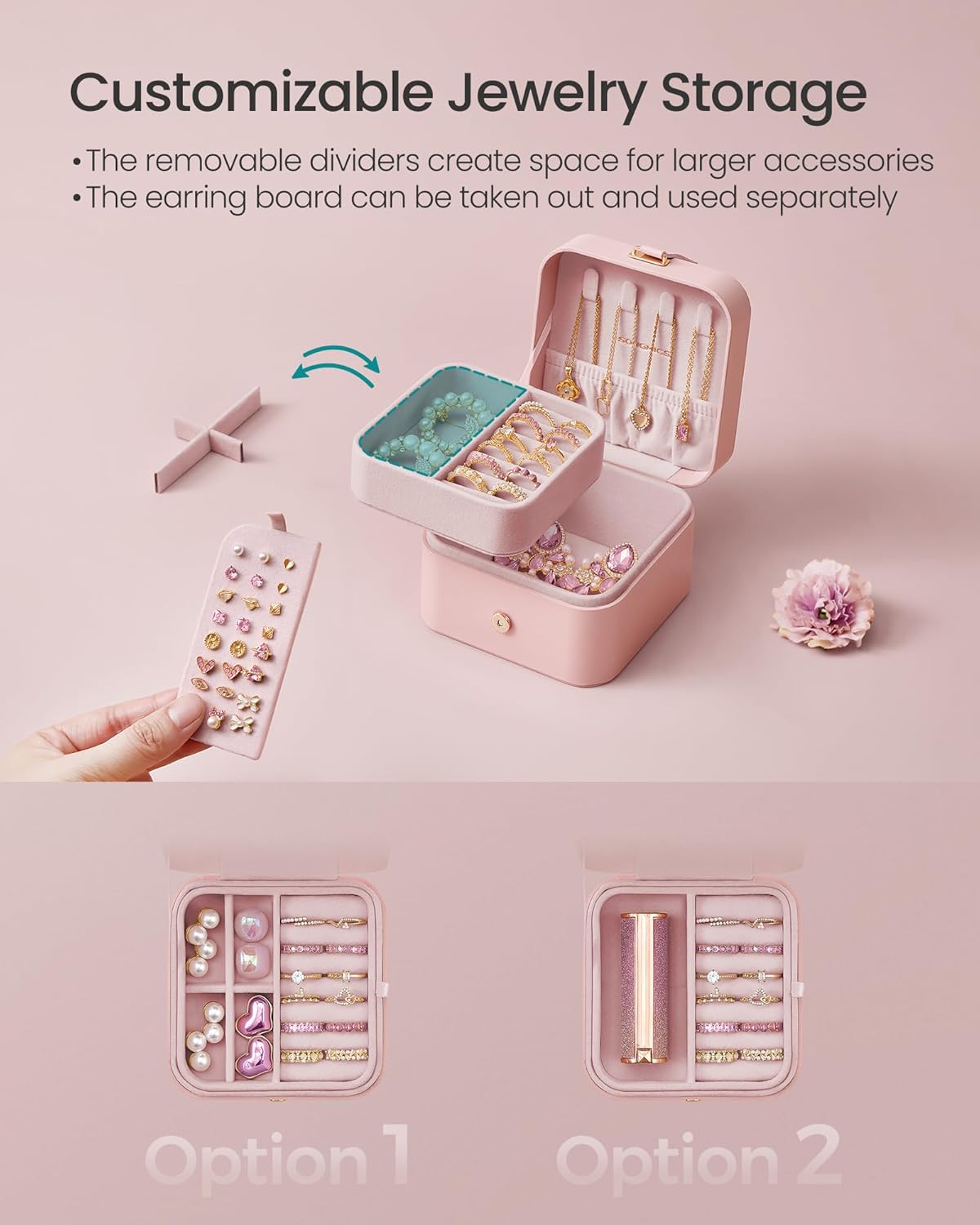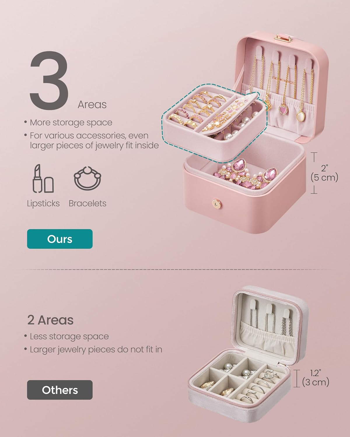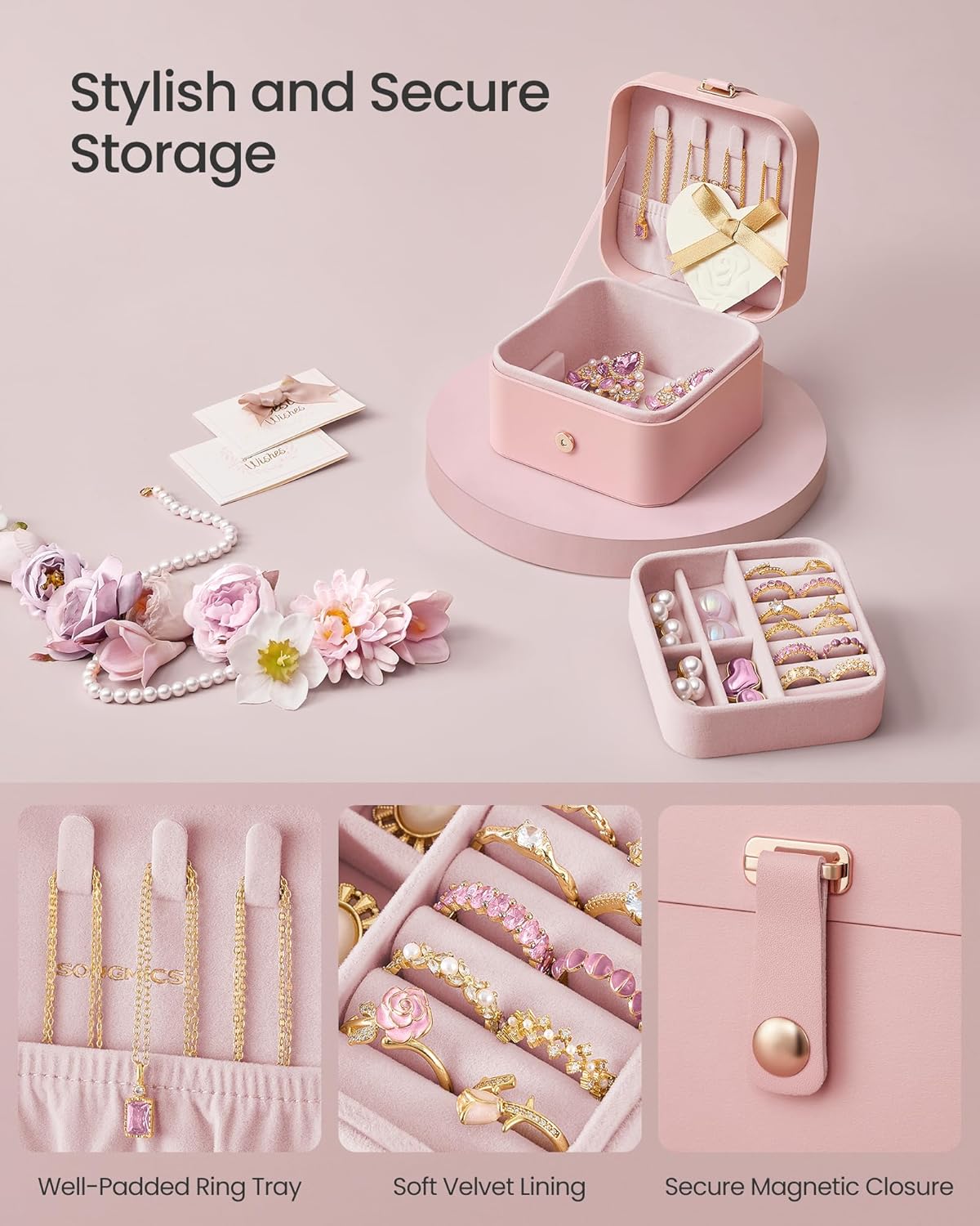 [Compact and Portable] Our 4.4 x 4.6 x 2.8 inches jewelry case easily fits in your bag or suitcase, allowing you to bring your favorite pieces on the go. Perfect for travel or business trips. Pack and carry with ease!