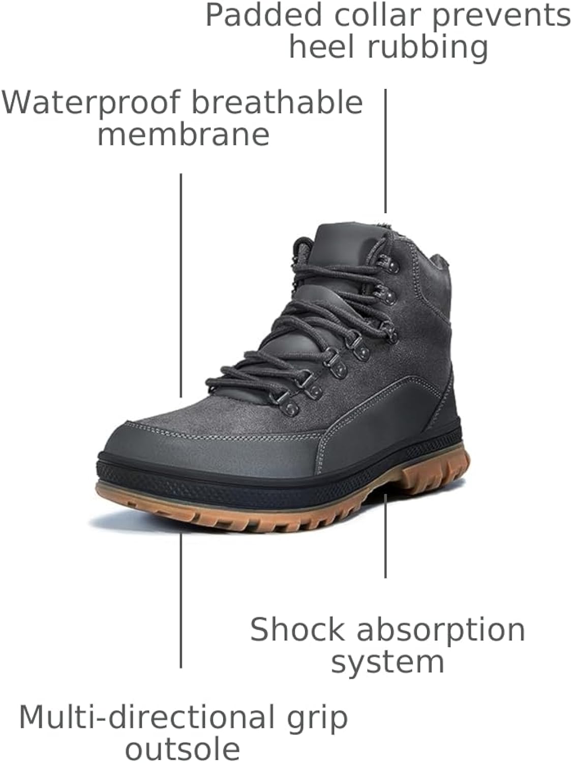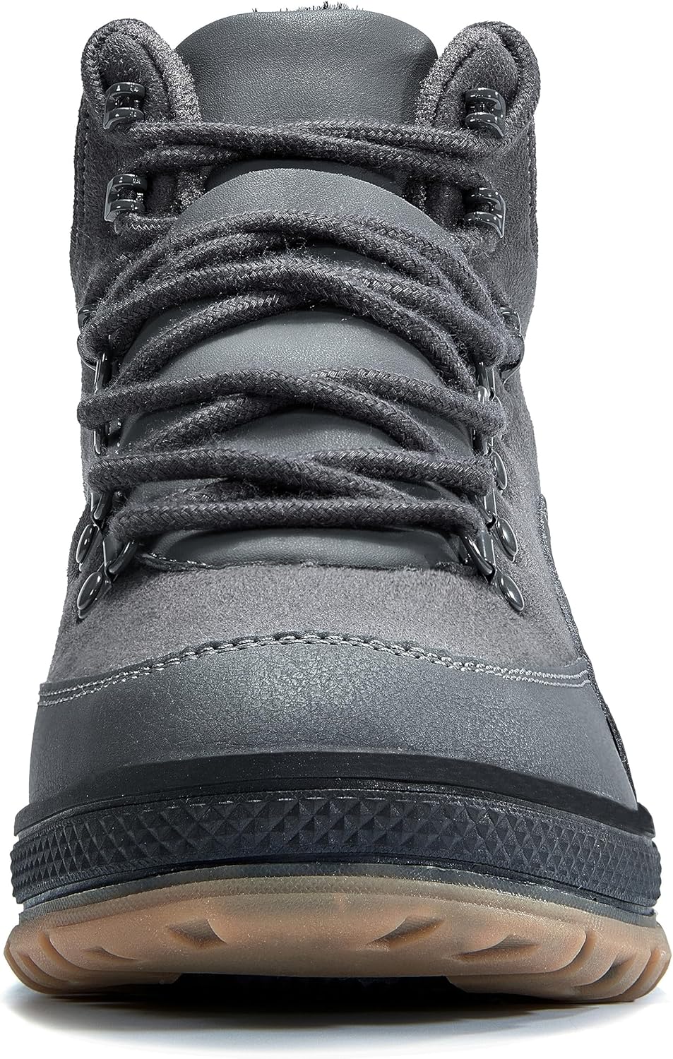 Rounded Toe & Modern-Casual Style: (UPGRADED) Featuring unparalleled design with latest breakthrough, these mens winter boots supply ergonomic fit for healthy feet and complete freedom of movement. Original two high top styles made of premium abrasion-resistant leather, suede and eco-friendly materials combined delicate metal rivets lead to an favorite fashion-conscious shoe collection, they are ideal winter outdoor shoes when you're on sidewalks, trail, or in the snow.