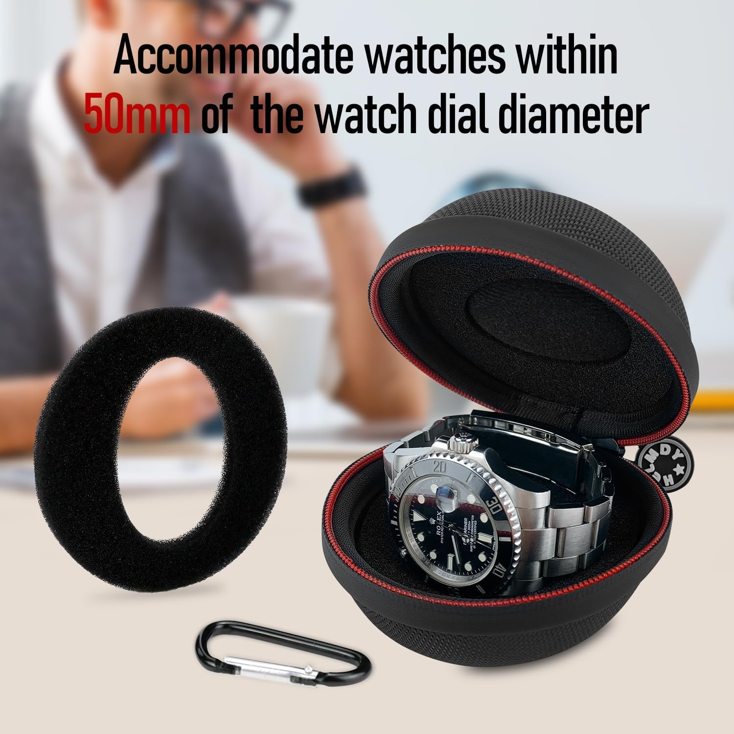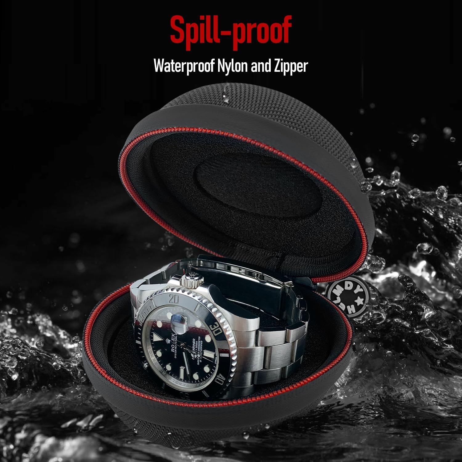 This single watch box has a donut shape and rigid outer shell built of the ballistic 1680 denier nylon and high-quality closing waterproof zipper, which enables it to be crush-proof, spill-proof, and perfectly strong yet compact that holds the watch securely, it is a very good option for safe storage and travel purposes