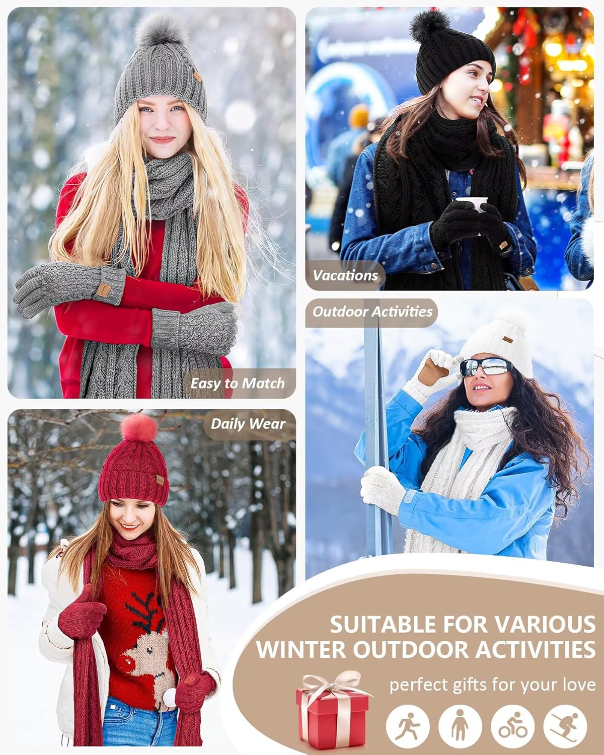 ♥Exquisite Gift For Your Loves♥: Available in multiple colors, this beanie scarf and gloves set for women features intricate knitting craftsmanship, creating fashionable designs that can be paired with most daily outfits. Perfect for running, skiing, sledding, camping, or any winter outdoor activities. It makes an excellent gift for family, relatives, and friends on occasions like Christmas, Thanksgiving, and birthdays.