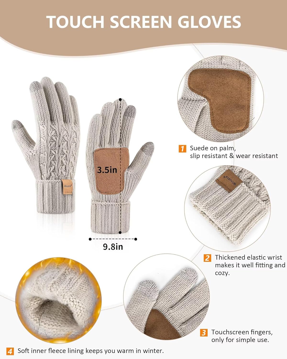 ♥Superior Quality Material♥: Winuesa winter hat scarf and gloves set for women are made from high-quality material. The external is constructed from acrylic knit for a comfortable, non-deformable stretch. The internal fleece lining provides soft skin touch, breathability, and warmth. This 3 in 1 winter set offers all-around protection for you in cold weather.