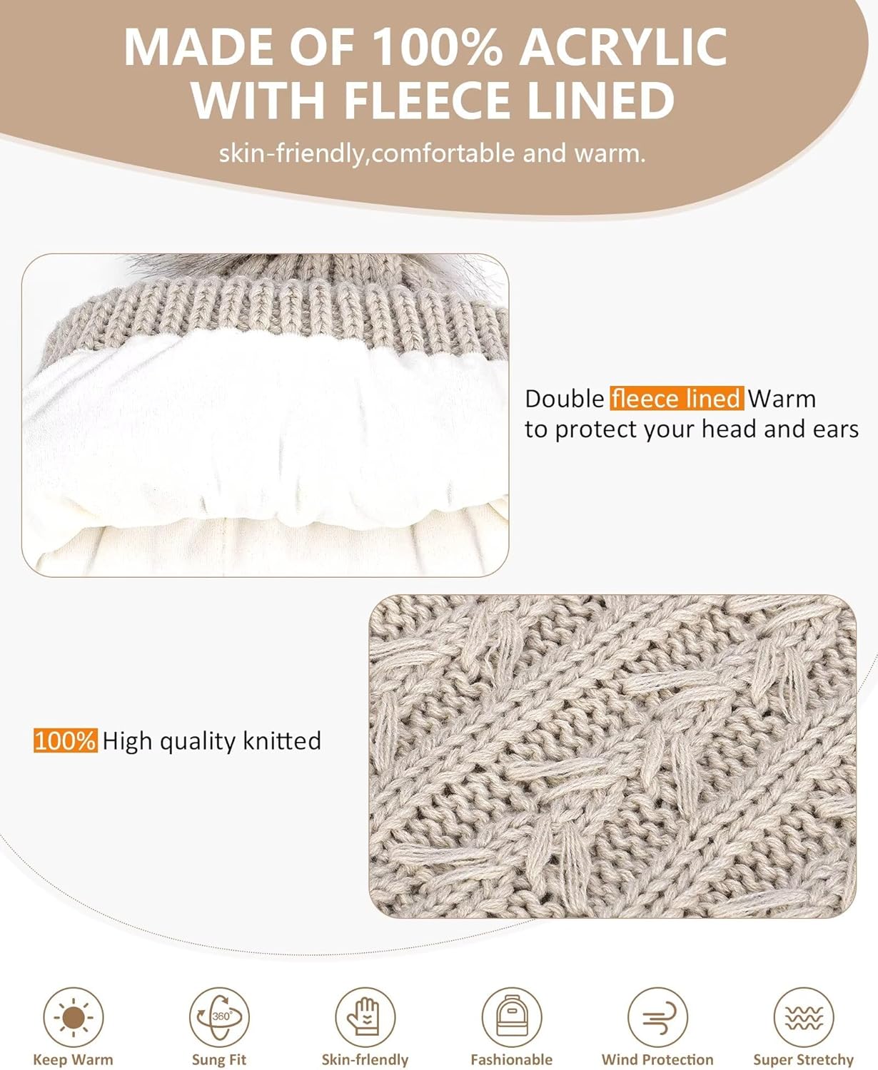 ♥Cozy & Warm Fleece Lined Beanie Hat♥: This winter hat in the set features a fluffy Pom Pom design that is larger than regular pom poms, adding a stylish and youthful touch. Lined with thick soft fleece, it provides comfort and warmth without causing any itchiness. The beanie offers not only fashionable and cute look but also excellent protection in the coldest winter days.