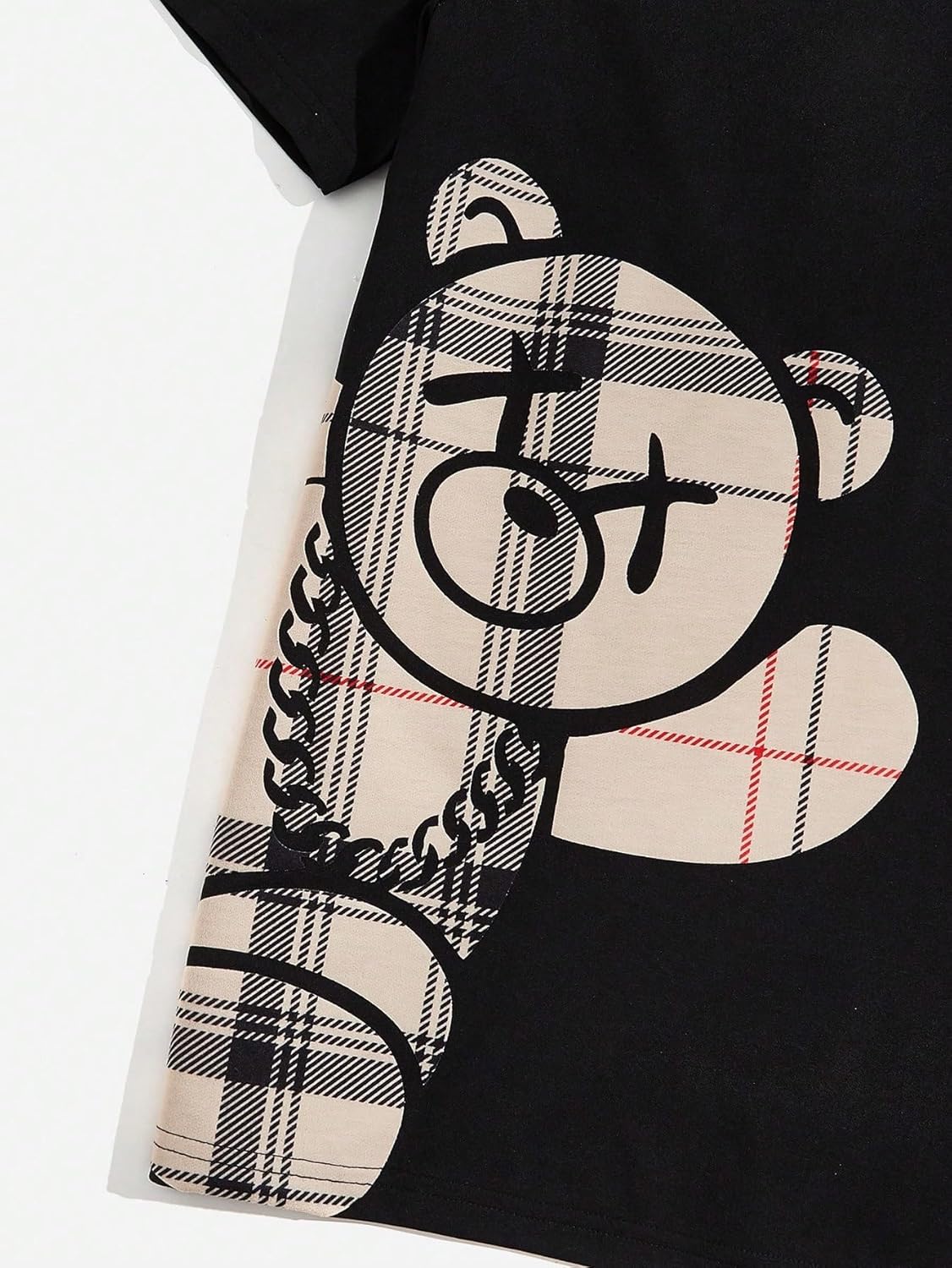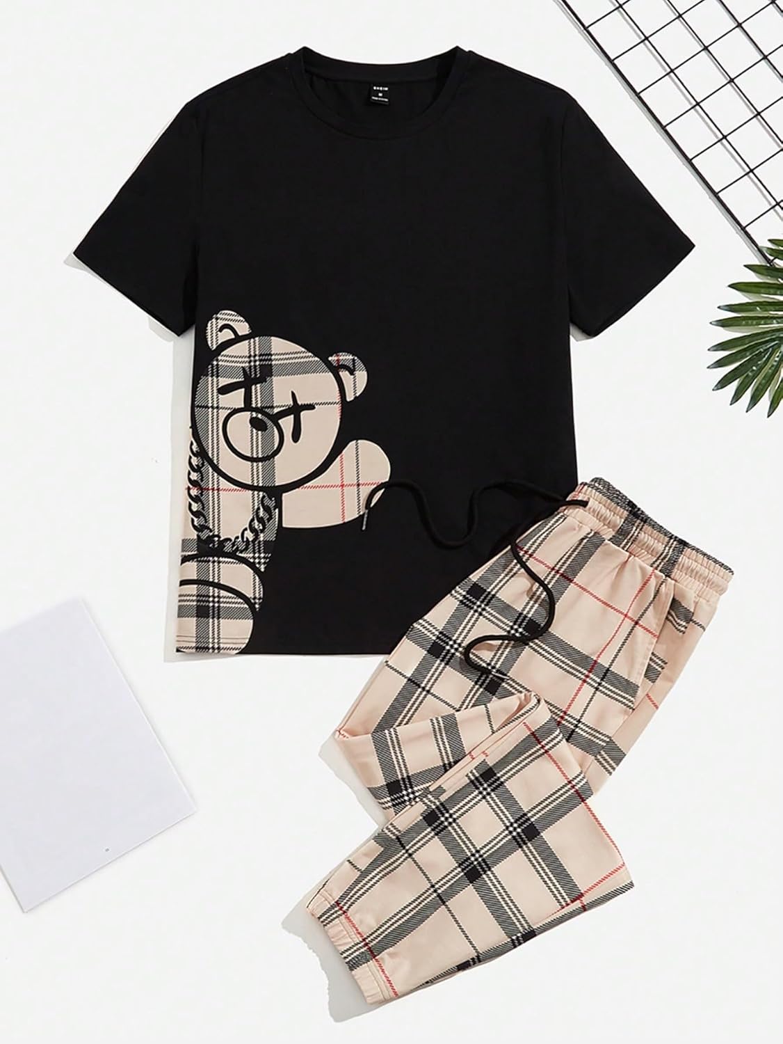 GORGLITTER Men's 2 Piece Outfits Bear Graphic Print Short Sleeve T-Shirt and Plaid Elastic Waist Pants Set