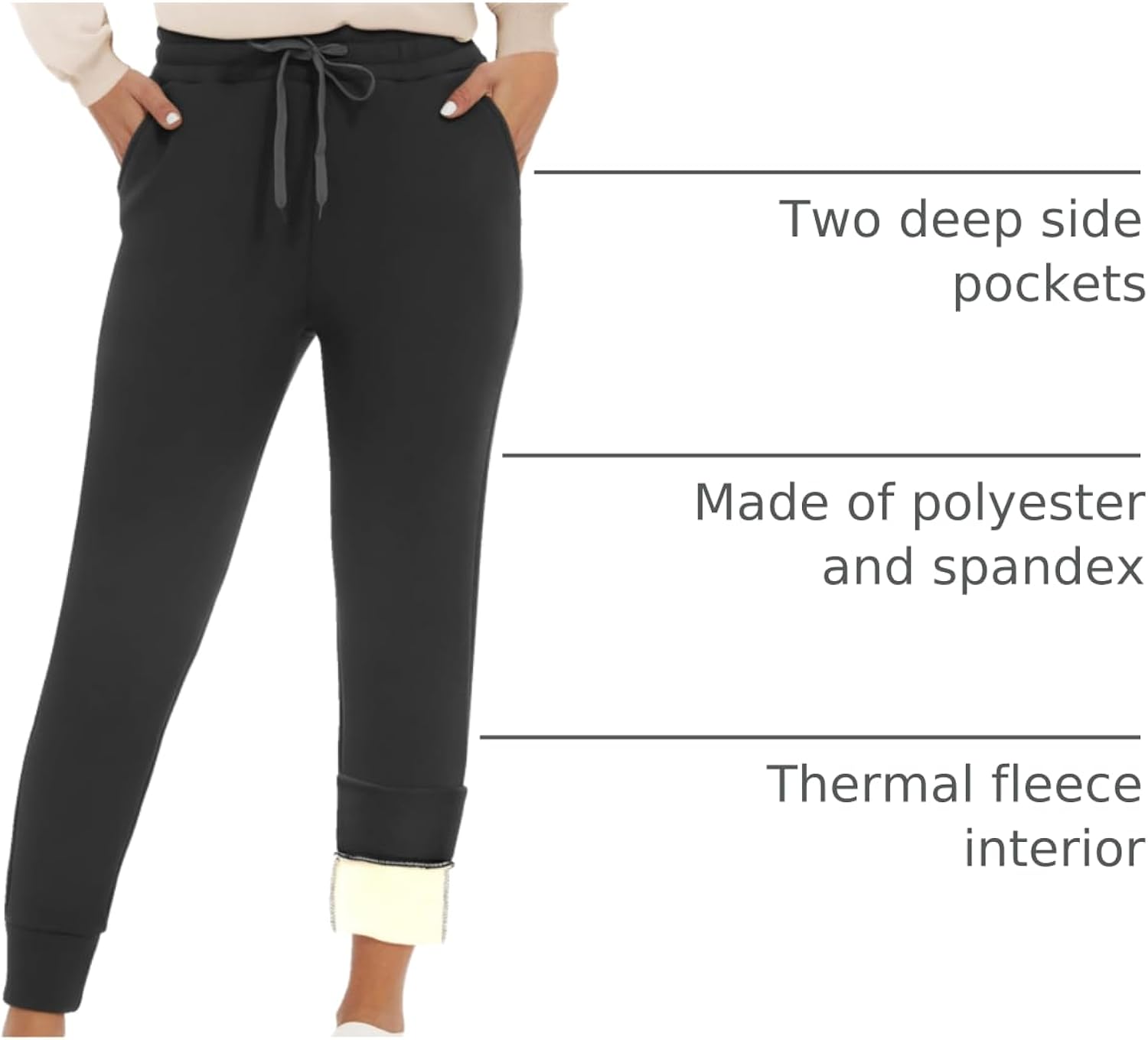 2 Side Pockets & Adjustable Waist: Women's joggers feature a high waist with drawstring for perfect adjustability. Roomy side pockets securely hold phones or keys. The tapered ankles give a flattering fit, and the cozy fleece lining locks in warmth.