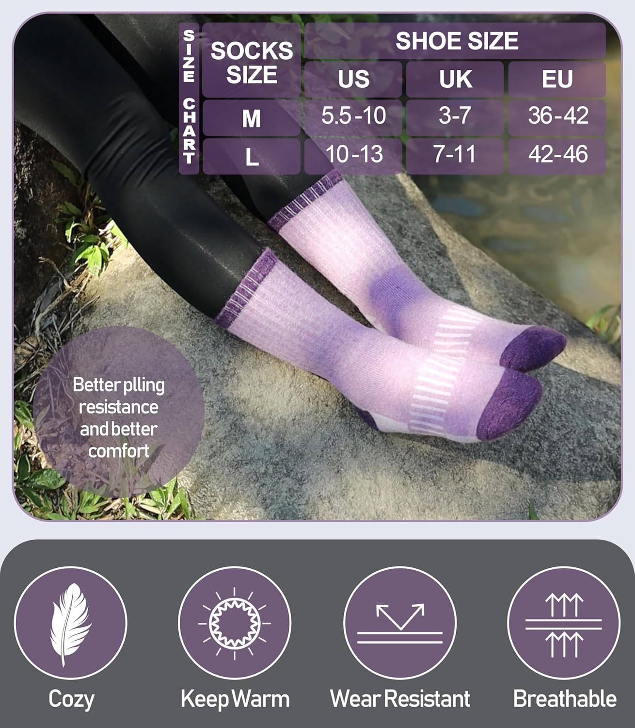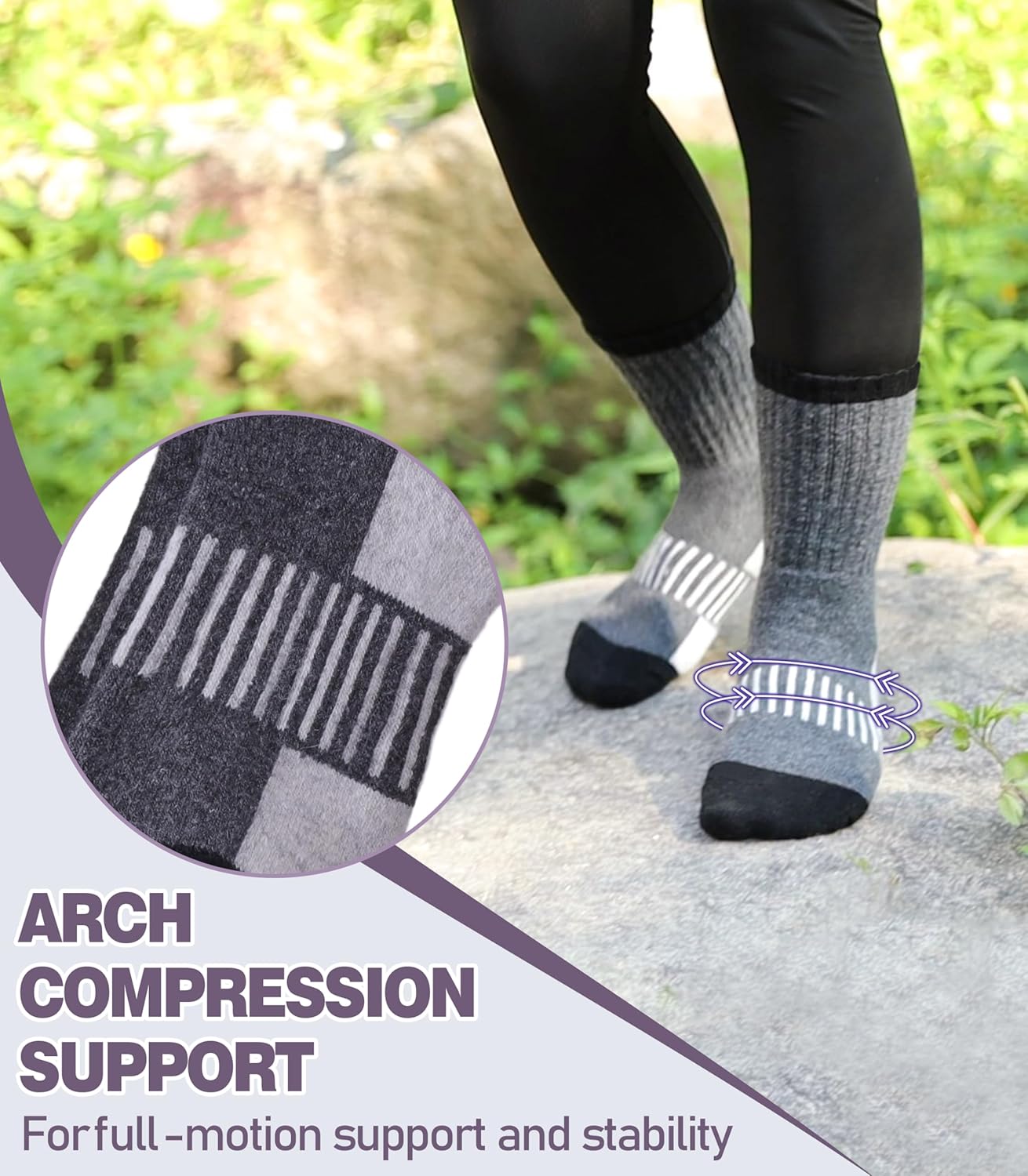 ELASTICITY - These warm hiking socks for womens have high elasticity and arch stripe,which can enhance the blood moving ,relieve symptoms varicose and keep socks stable.They can greatly improve your comfort in hiking , running , walking , climbing , trekking or everyday wear.