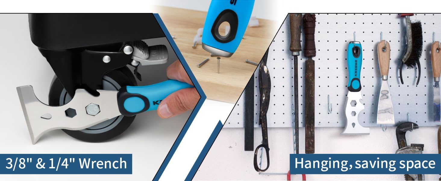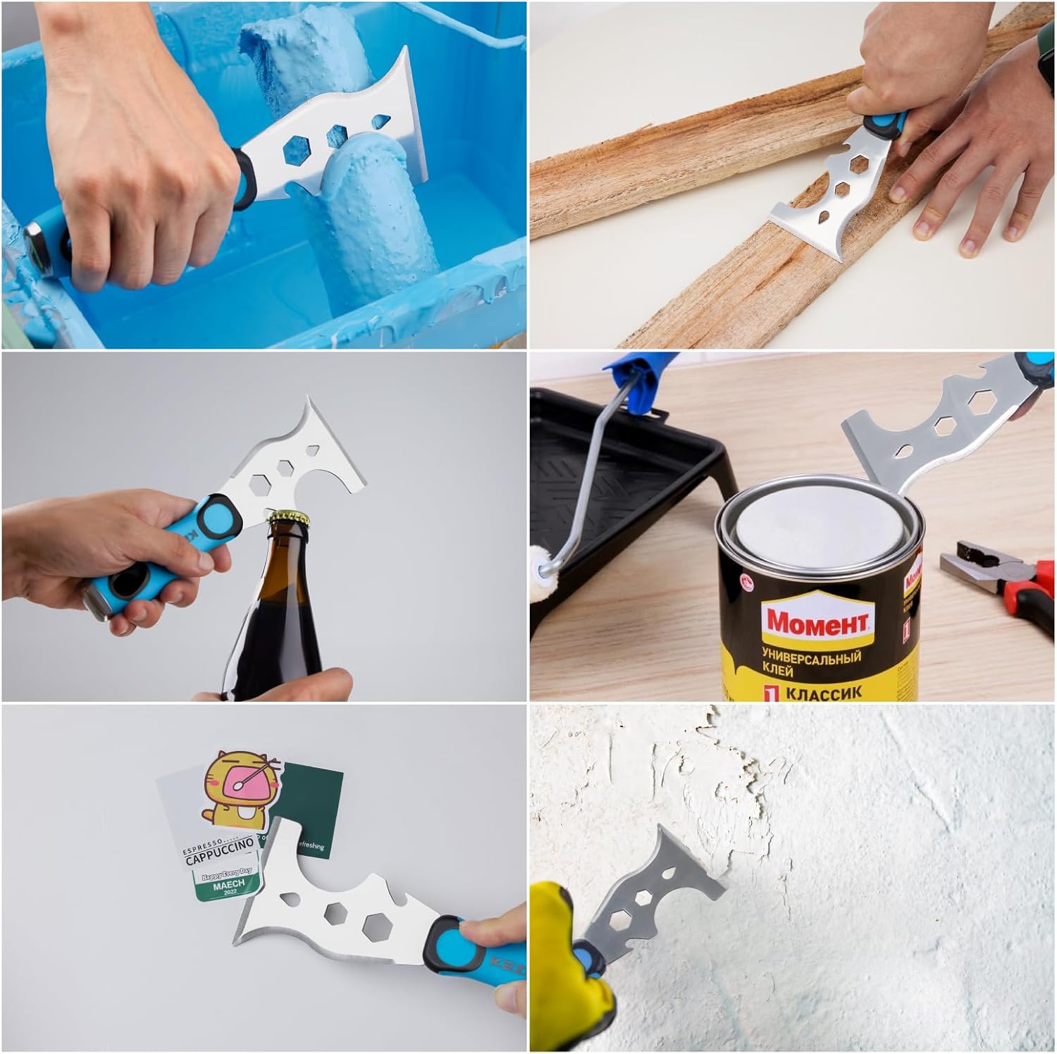 13-IN-1 PAINT TOOL: Multiple uses putty knife scraper can be used as a Gouger, Straight Scraper, Screwdriver, Roller Cleaner, Bottle Opener, Can Opener, Nail Puller, Curved Scraper, Convex Scraper, 3/8” Wrench, 1/4” Wrench, Metal Hammer End, Hanging Hole is ideal for home improvement and professional painters.
