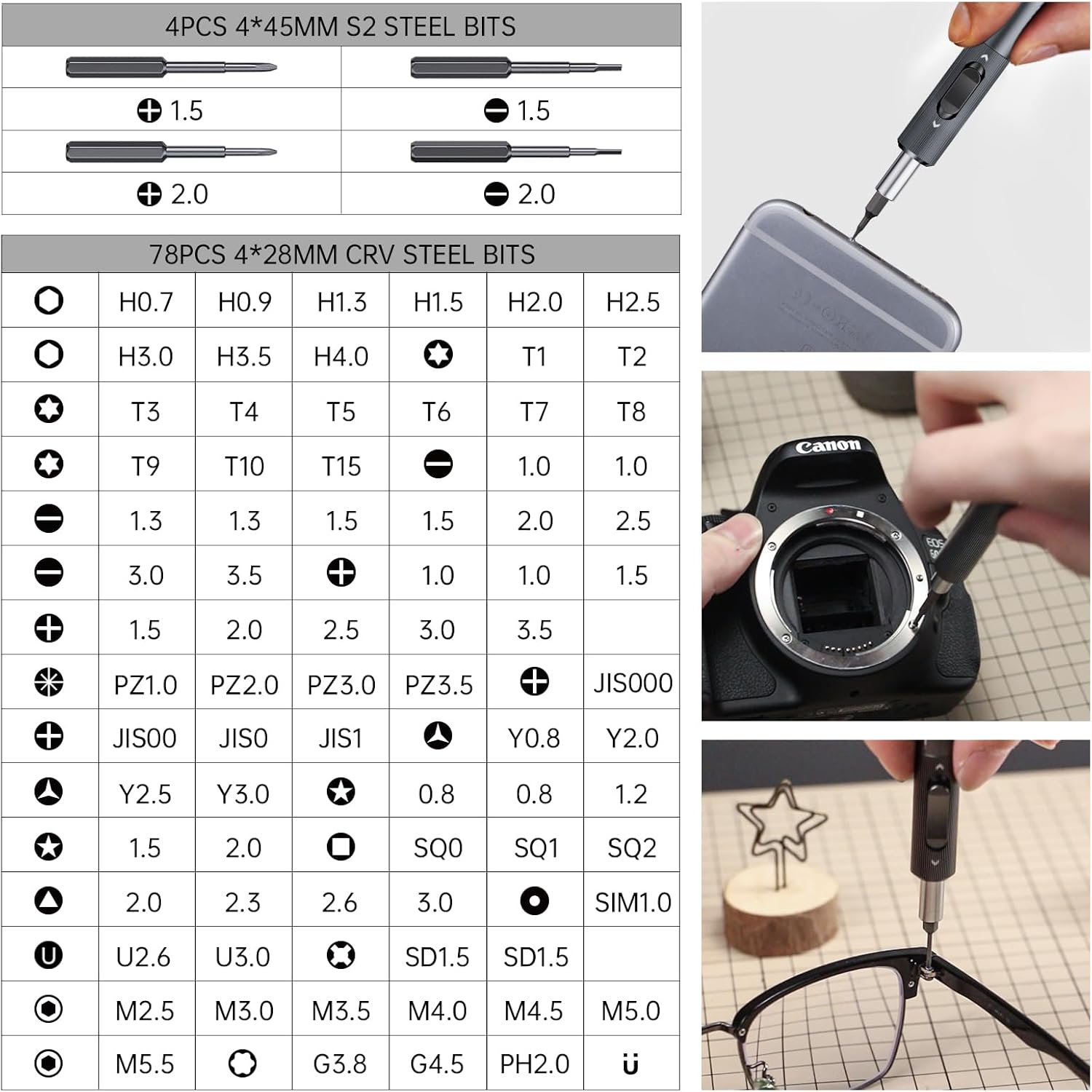 ??The 105 in 1 precision screwdriver kit includes 17 types of 90 precision bits, including 78 standard bits (4.0*28mm) suitable for repairing most electronics such as laptop, computer, Macbook, phones, drone, cameras, rc car, and glasses, as well as 8 home bits (6.3*25mm) suitable for daily home maintenance needs such as furniture disassembly, PC modding, bikes, and other scenarios.
