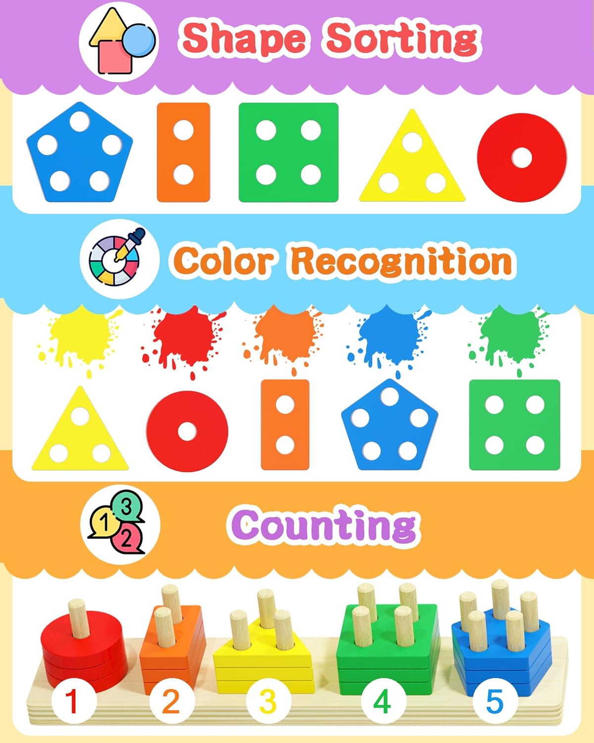 Safe and high-quality toddler toys : We insist on using high quality wood raw materials to provide safe and fun toys for toddlers. The toddler learning toys with a moderate geometric size and smooth edges, can be grasped well by babies while protecting the baby's delicate skin. We also use the water-based paint, the color more vivid, non-toxic, odorless and anti-fade, for your baby safe and happy childhood.
