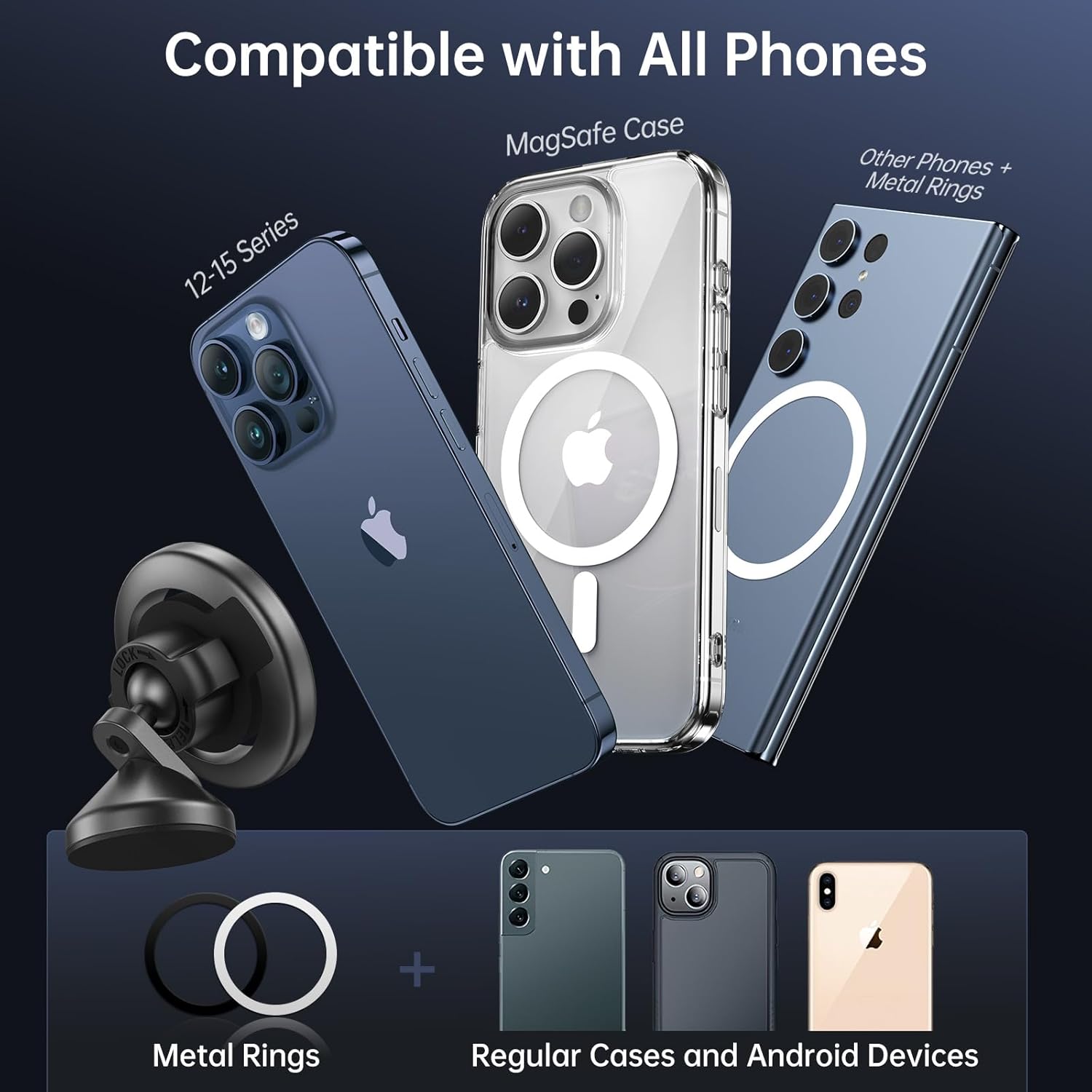 "【Unmatched Magnetic Strength for Secure Hold】 Equipped with 16 N52-grade neodymium magnets, this MagSafe car phone mount guarantees a powerful and stable magnetic connection. The magnetic force reaches up to 12N (1.2 kg) for iPhone 13-15 series, 15N (1.5 kg) for MagSafe cases, and 25N (2.5 kg) for phones with metal rings. (For iPhone 12 series, use MagSafe cases or included metal rings.) Enjoy peace of mind knowing your phone stays securely in place during every drive."