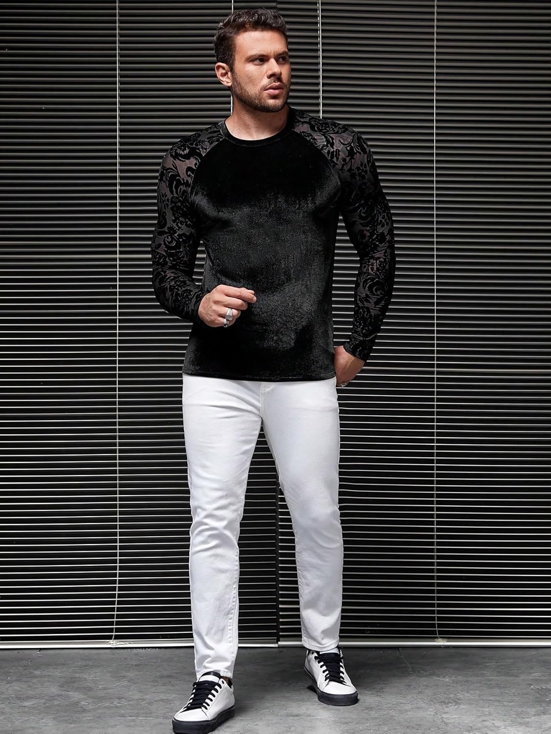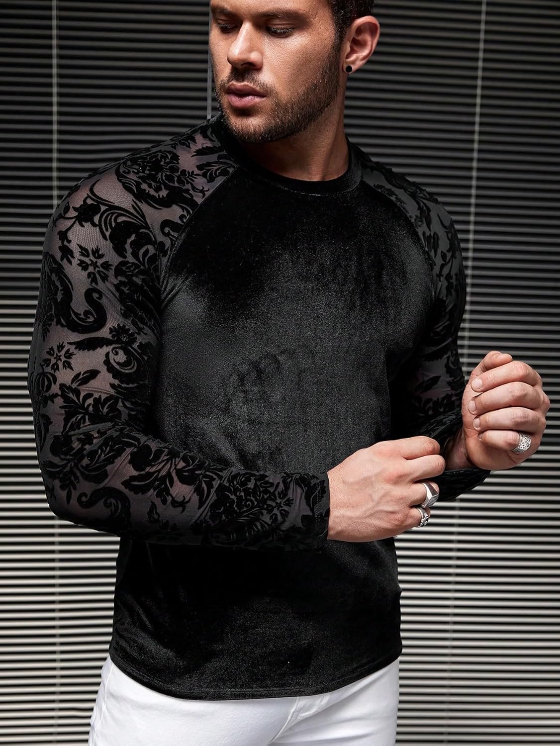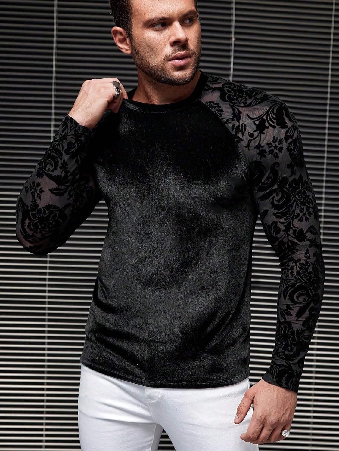 Features: floral lace mesh, velvet fabric, crewneck, raglan long sleeve, casual tee tops for men