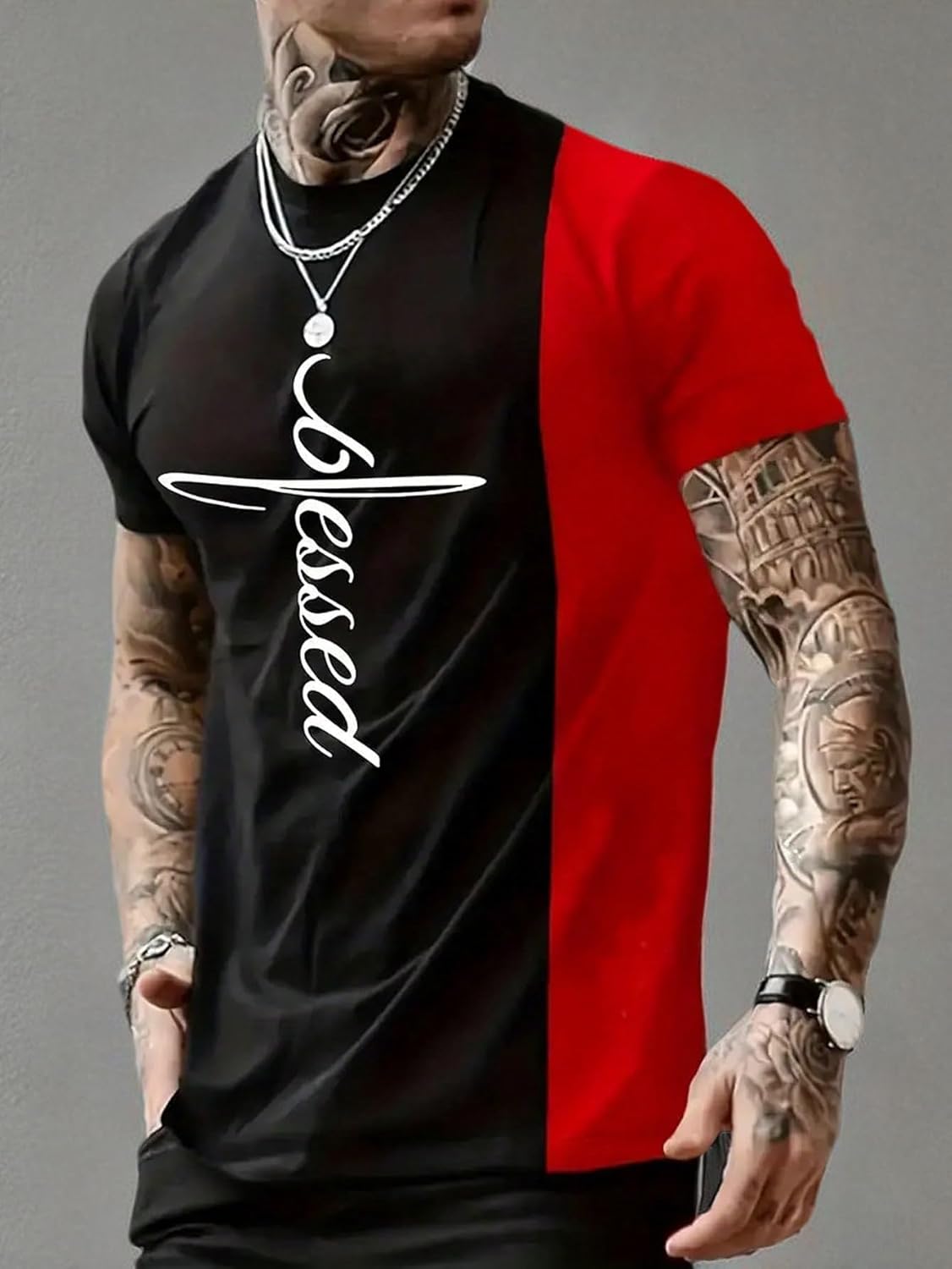 Features: letter, colorblock, round neck, short sleeve, regular fit, tee shirts for men, fashionable