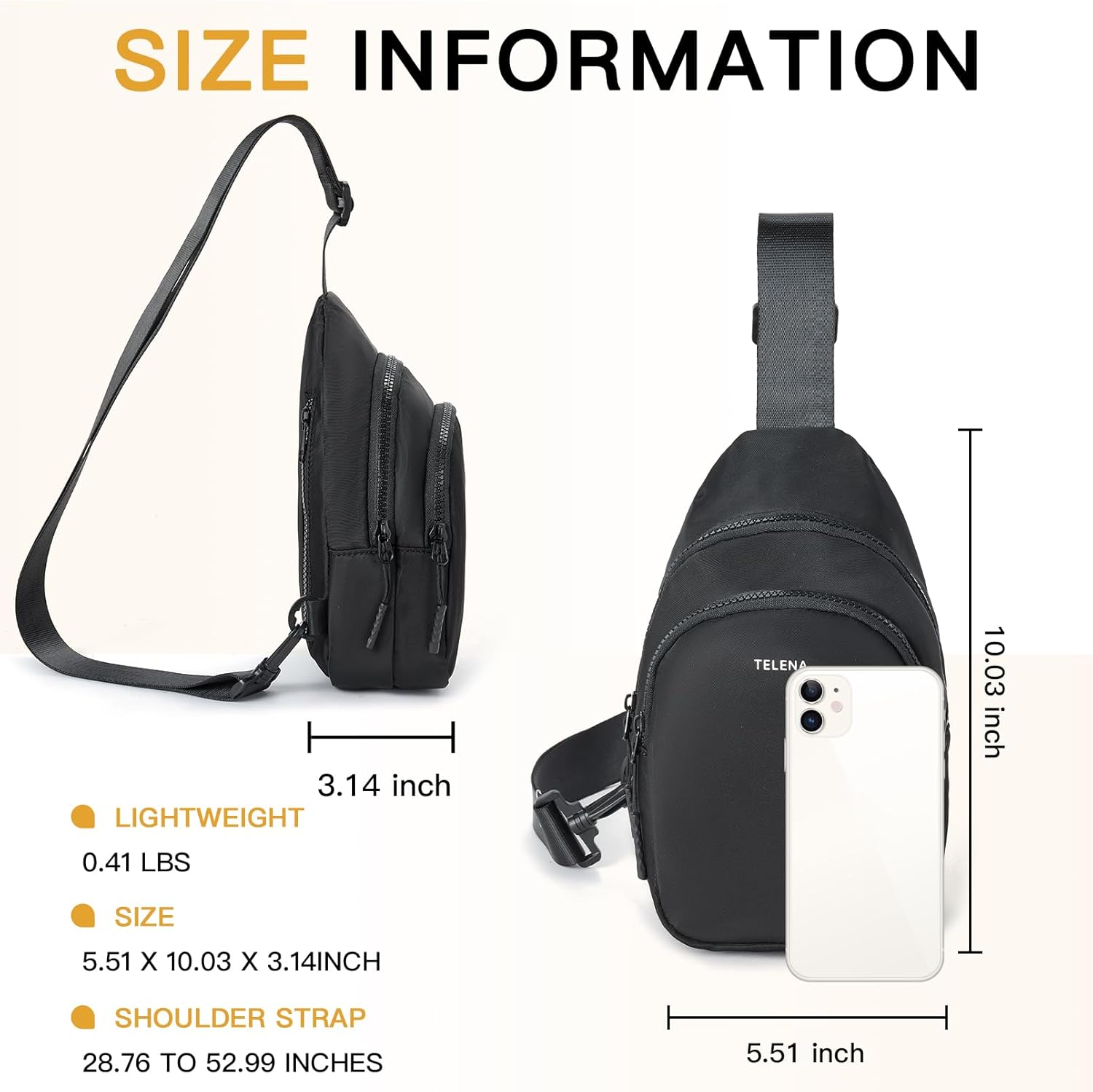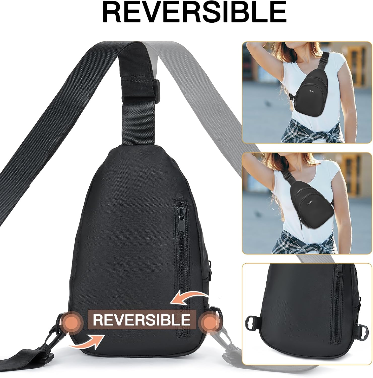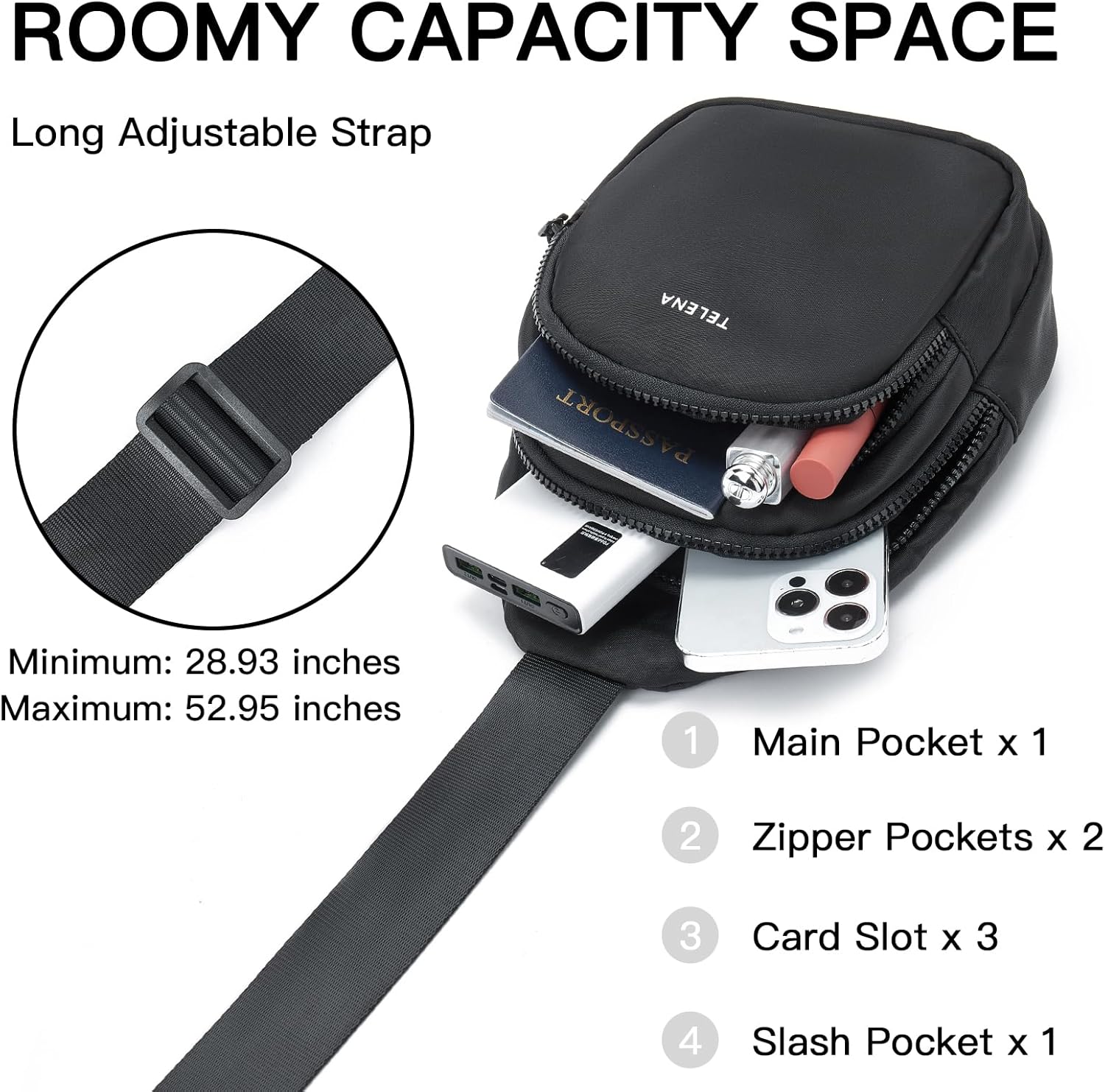 Long Adjustable Strap: Featuring an adjustable strap, the strap on Telena fanny pack crossbody can be effortlessly extended from 28.93 to 52.96 inches. It allows the bag to seamlessly transform into various styles such as a fanny pack, a cross body bag, a chest bag even a sling backpack