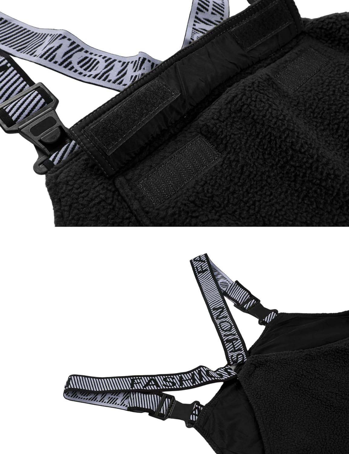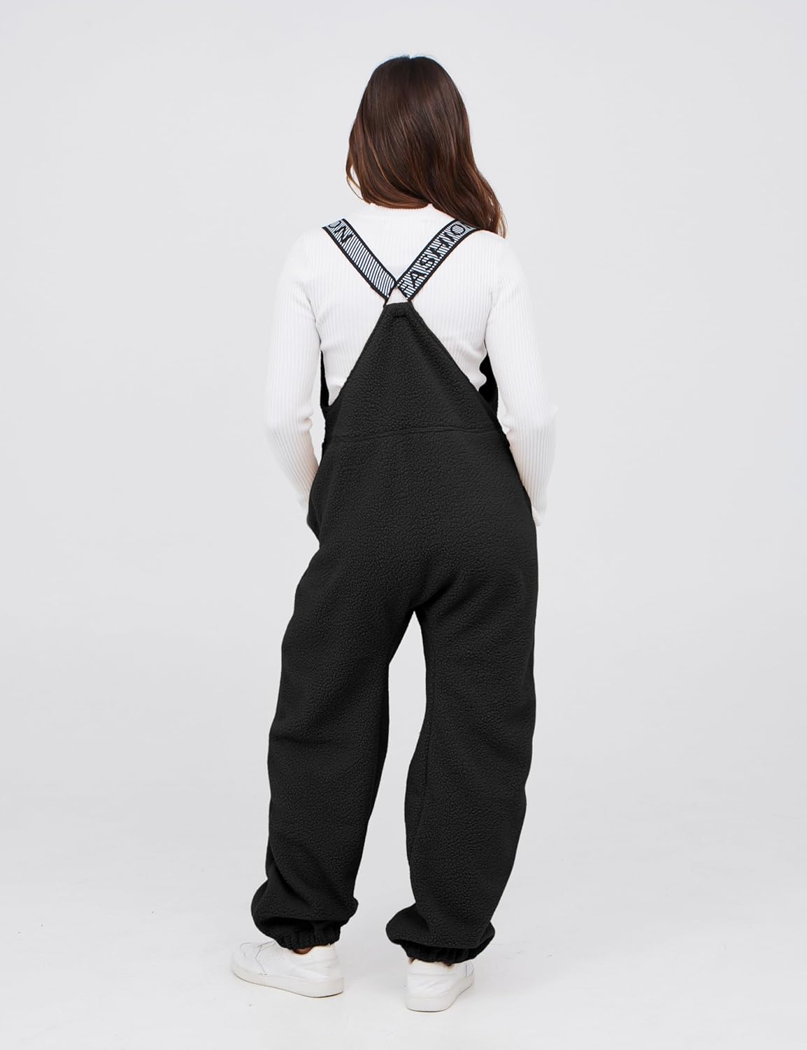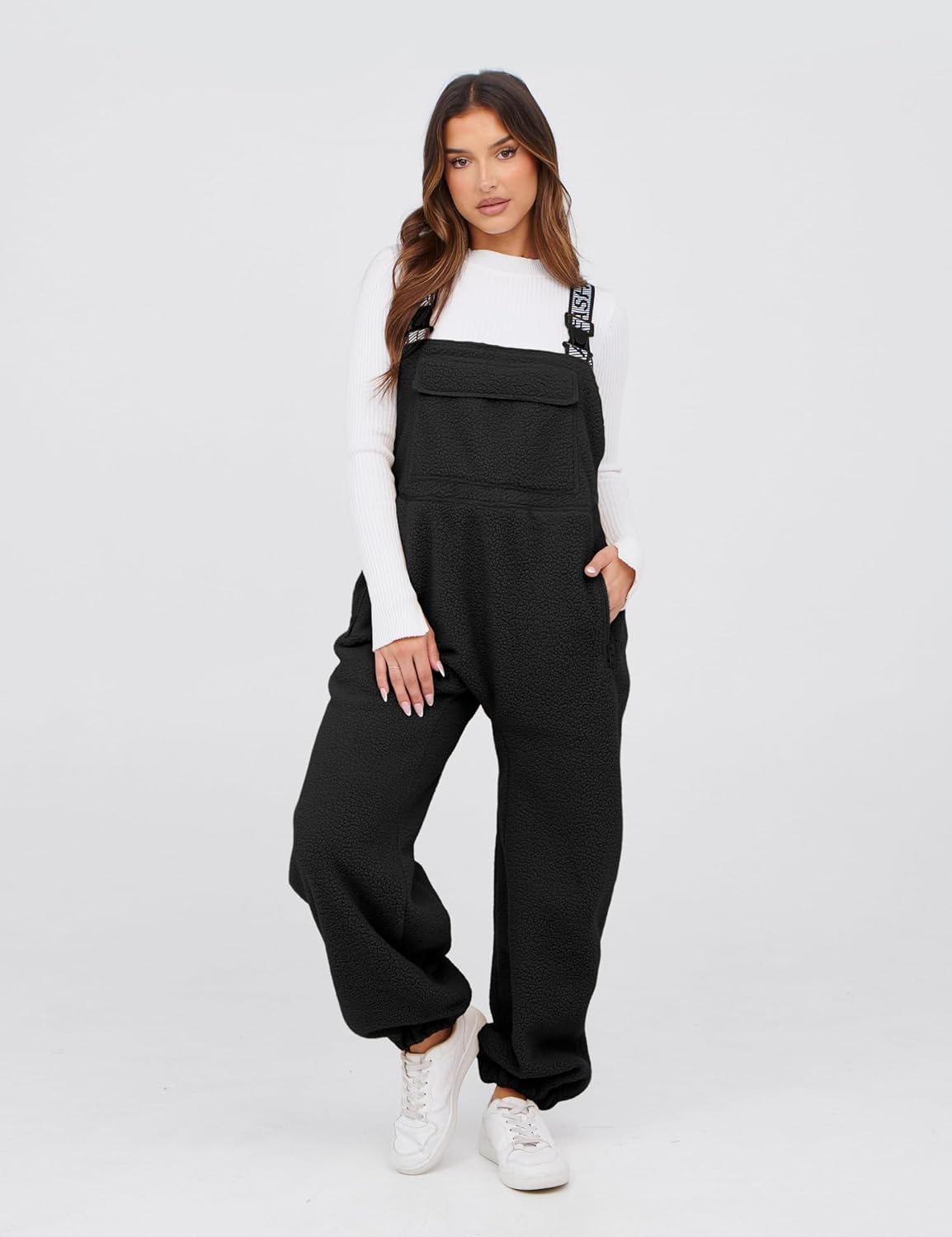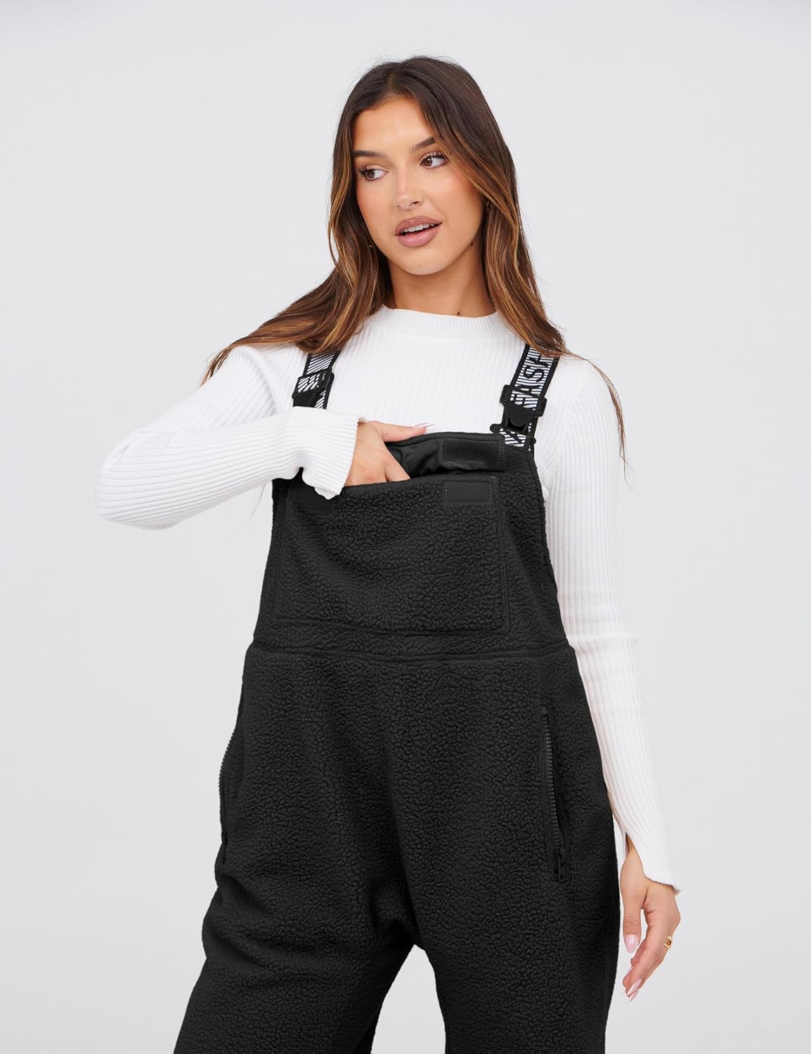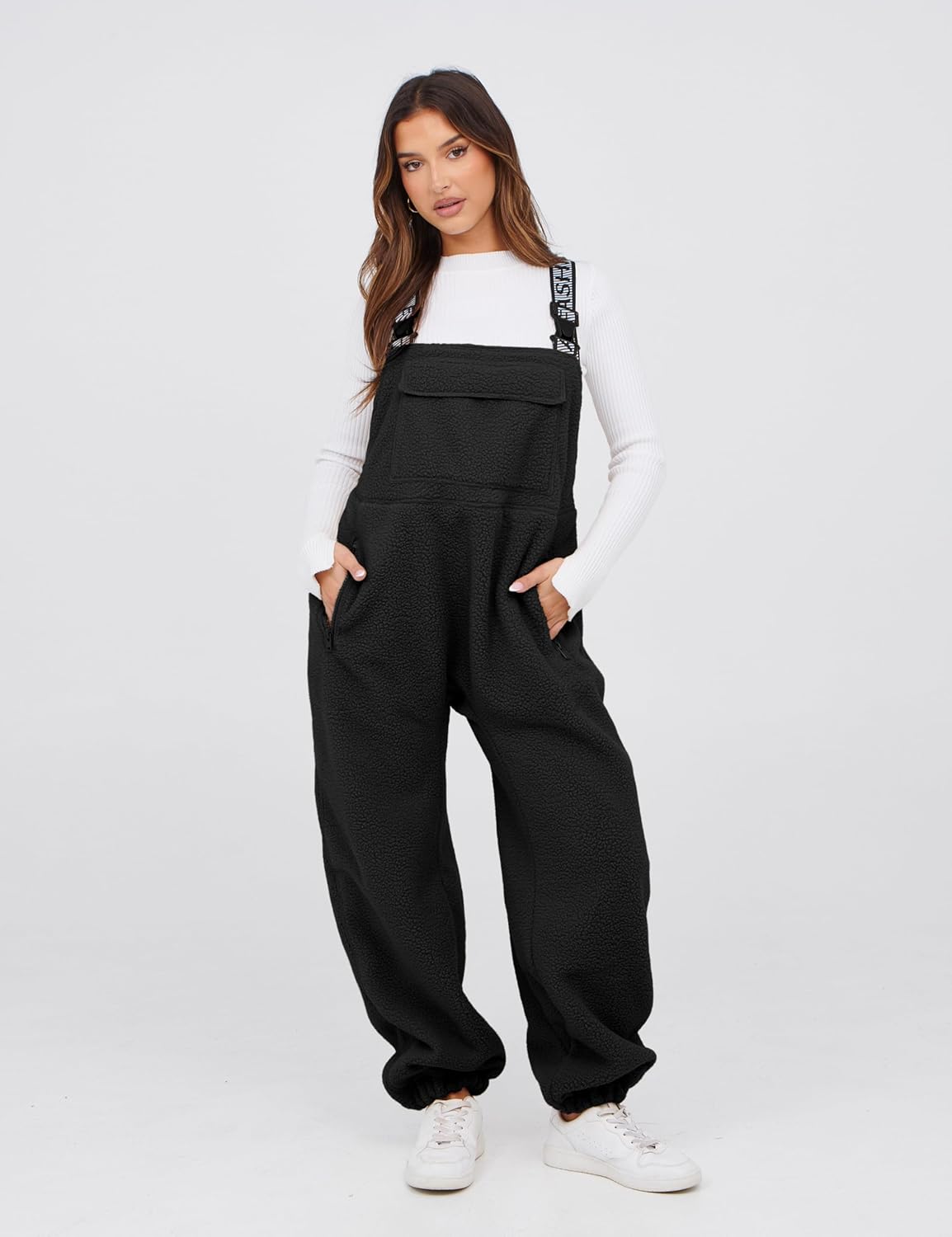 Details: Fleece overalls women featured adjustable elastic straps with buckle closures, front pouch pocket, zipper pockets on legs, tapered legs, ankle-length