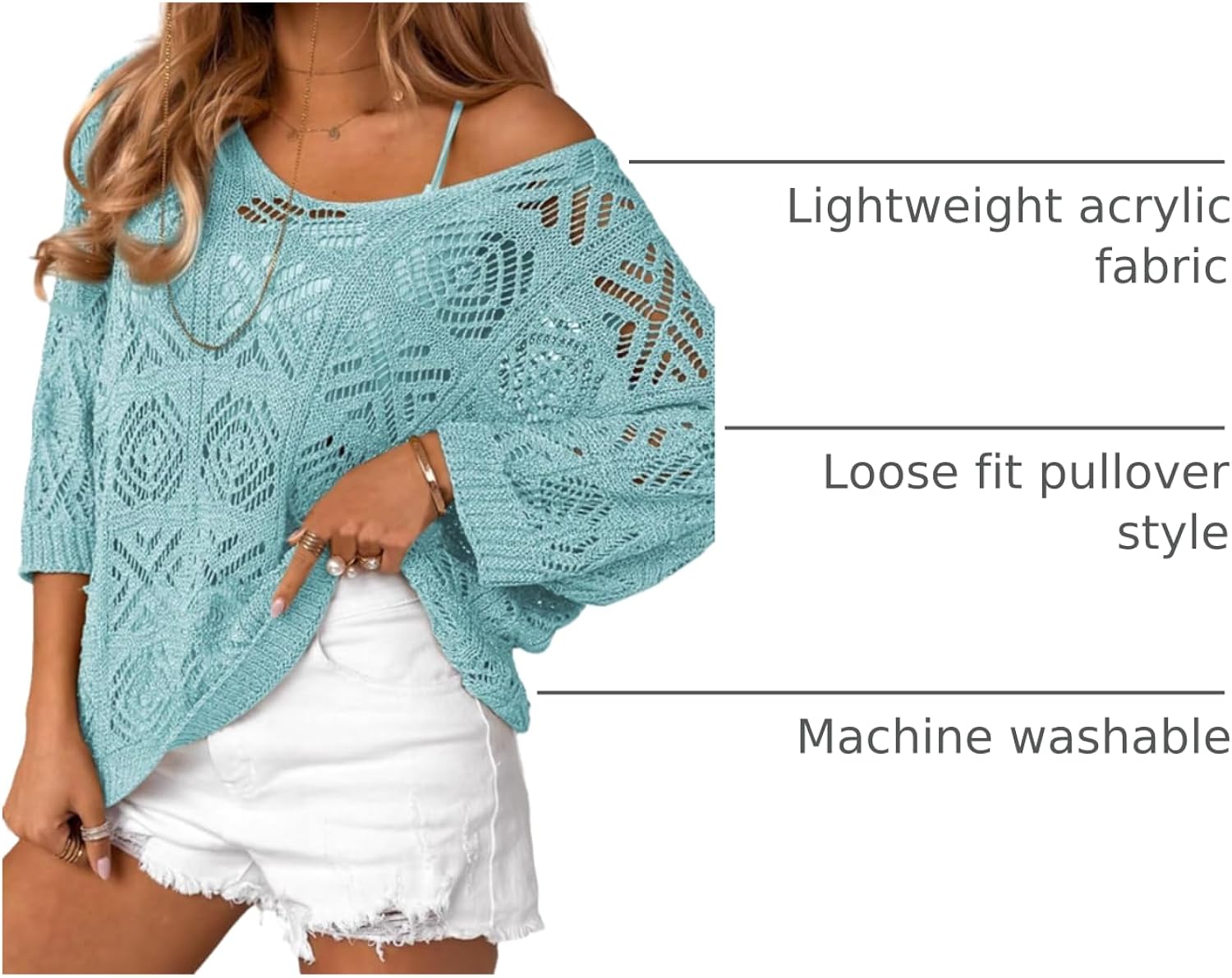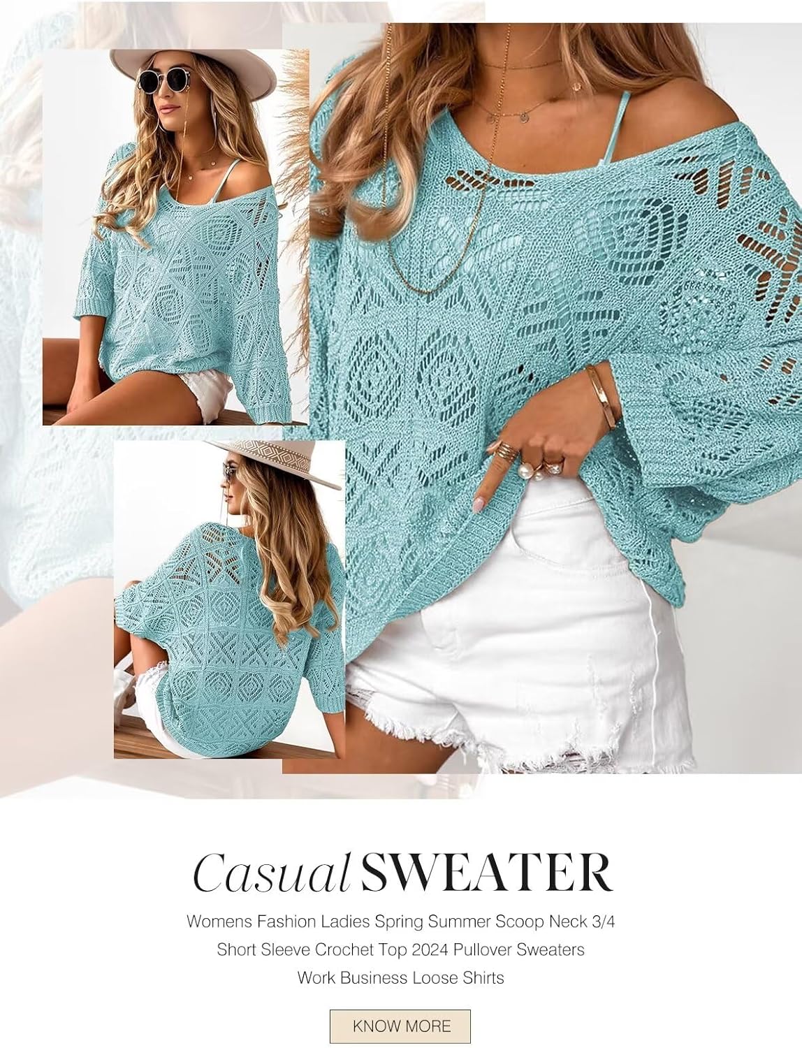 Dokotoo Women's 2025 Spring Summer Crochet Hollow Out 3/4 Sleeve Pullover Sweater Off Shoulder T-Shirts Off Shoulder Tops for Women Bathing Suit Cover Up for Women