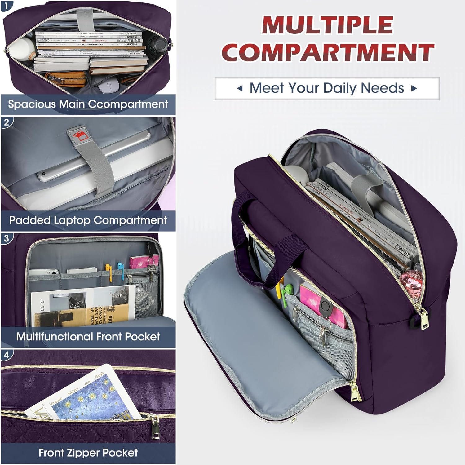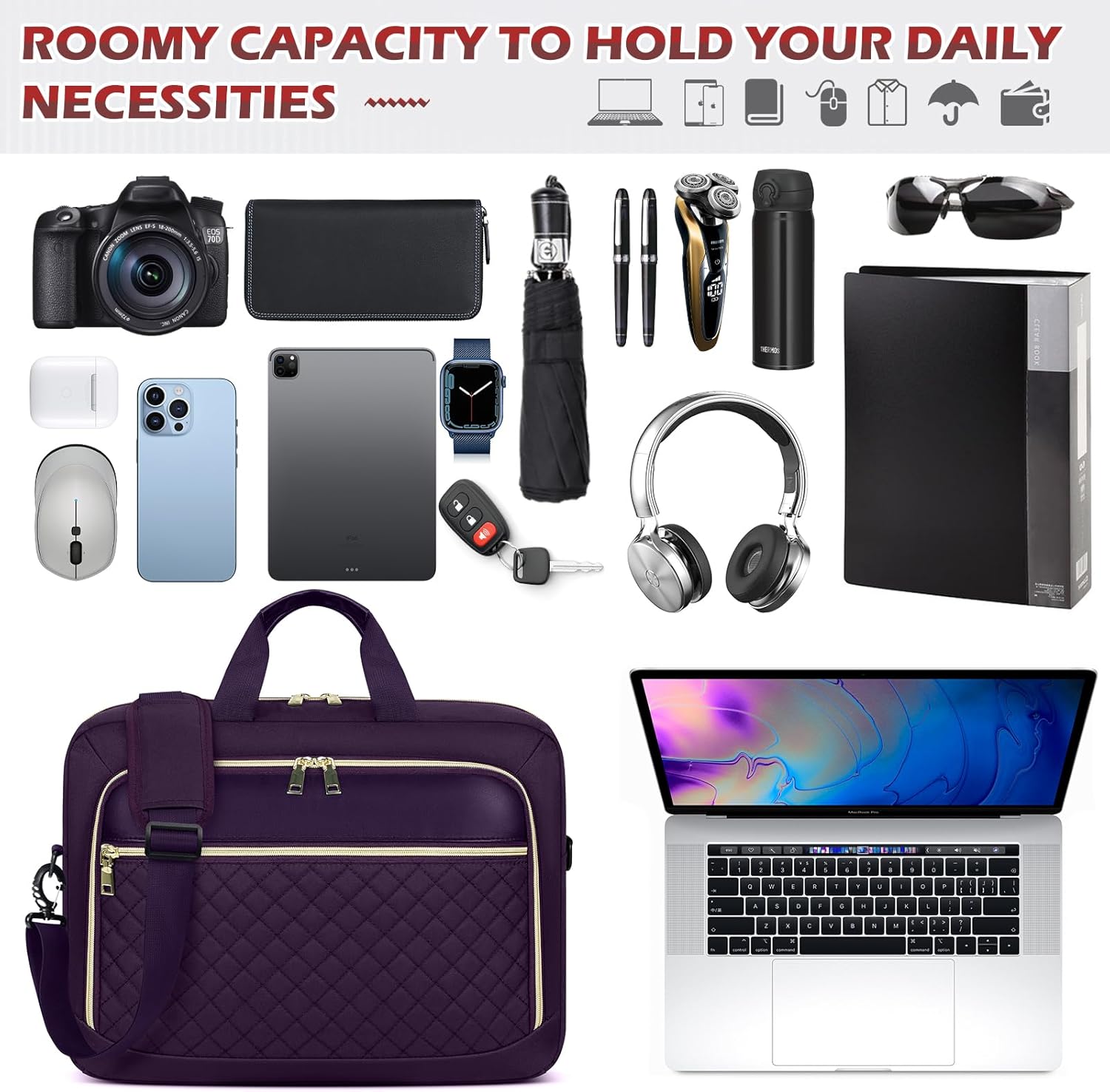 【Large Capacity & Multiple Pockets】3-compartment design makes this computer bag meet all your needs. Main compartment features padded laptop sleeve that holds 17.3" laptop and 12.9" iPad, 2 mesh pockets for power cord and mouse, and 2 elastic mesh pockets for water bottle or umbrella. Front organizer compartment with key ring, 2 pen slots, 1 mesh zipper pocket and 2 internal slip pockets. Large front pocket for magazines, textbooks, paper, kindle, passport, wallet, etc.
