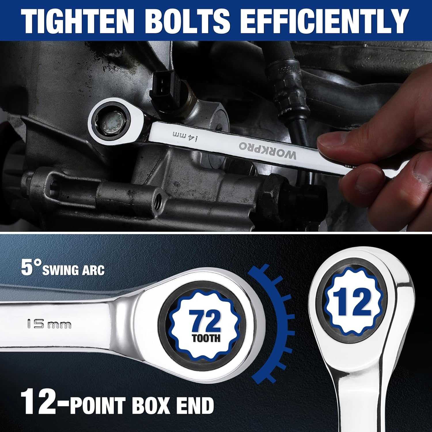 Precision Design for Efficiency: The combination wrench has a 12-point box end. To prevent round-off, it contacts and applies force to the flat sides of fastener heads rather than the corners. And combo ratchet wrenches have 72 teeth ratchet, realize 5 degrees swing to help tighten bolts efficiently, and are conveniently suitable for tight spaces.