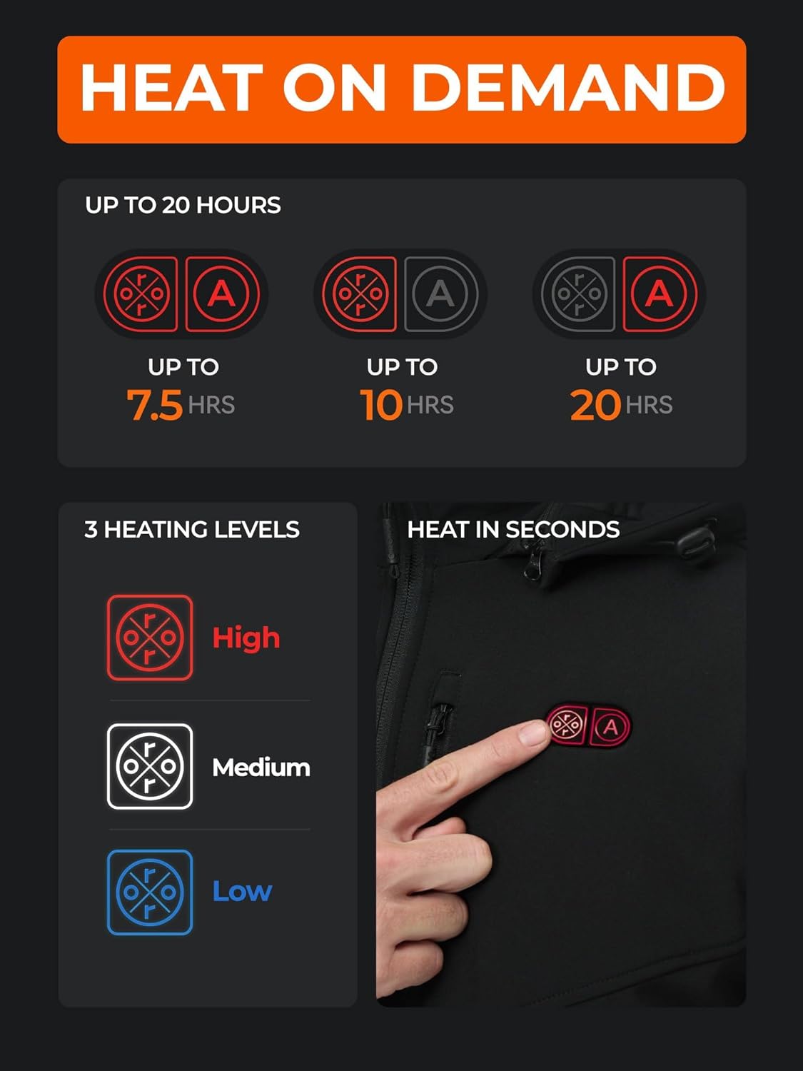 Dual Control Heating: The dual control heating system allows you to adjust the temperature settings for different parts of the jacket independently. With three heating levels (high, medium, low), you can customize the warmth to suit your preference and the weather conditions.