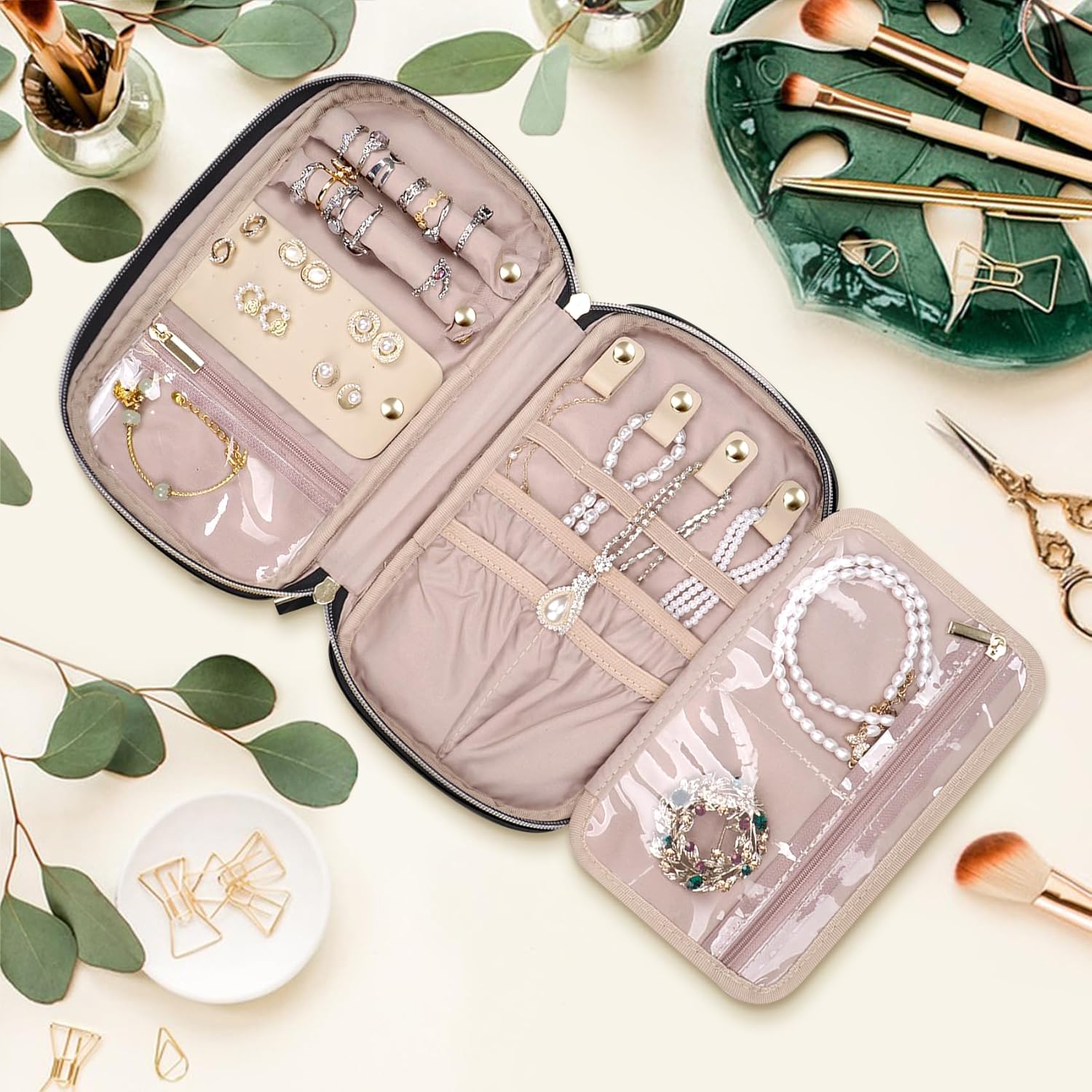 【Anti-Tangle Storage】: No more tangled jewelry! This travel jewelry bag features designated compartments for necklaces, earrings, rings, bracelets, and watches, ensuring each piece stays neatly in place.