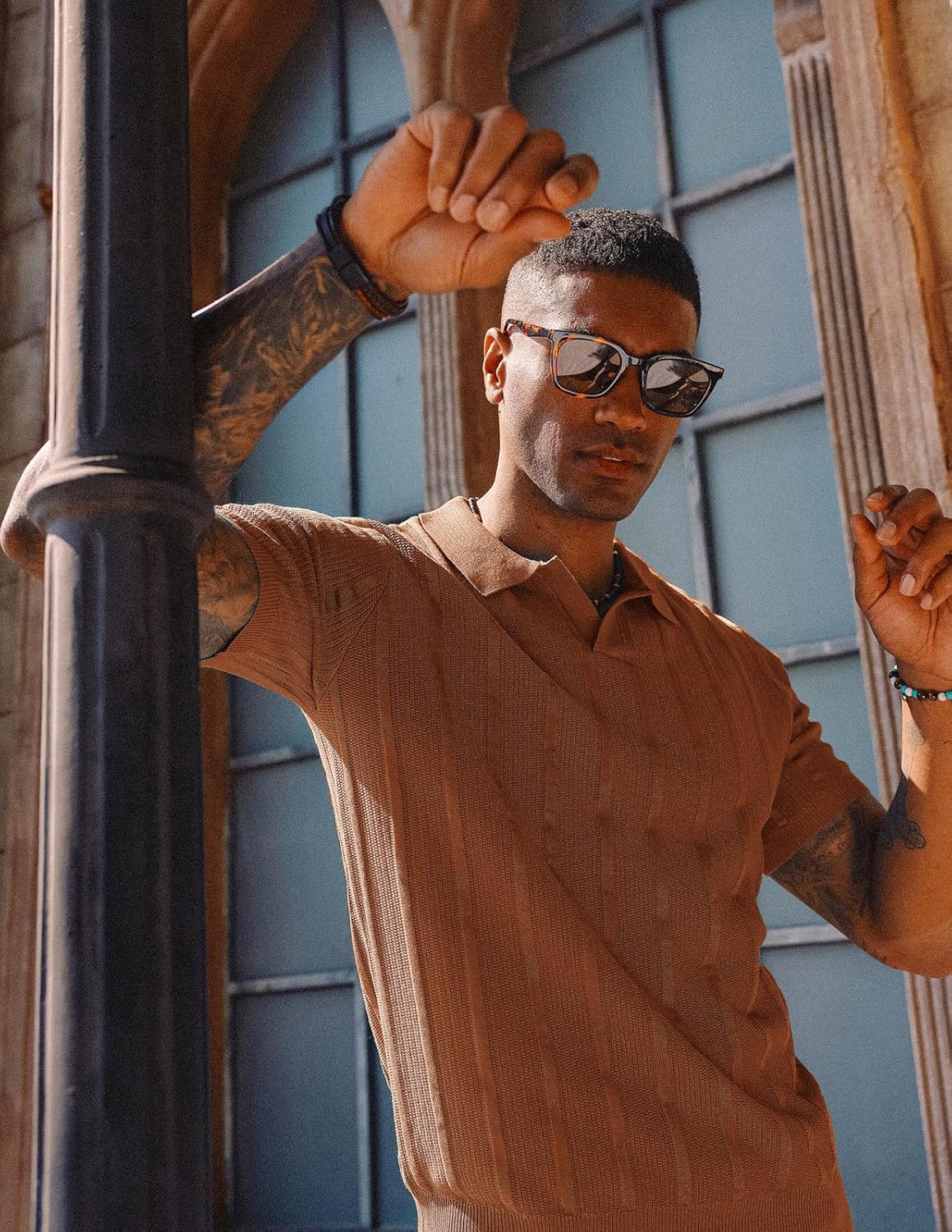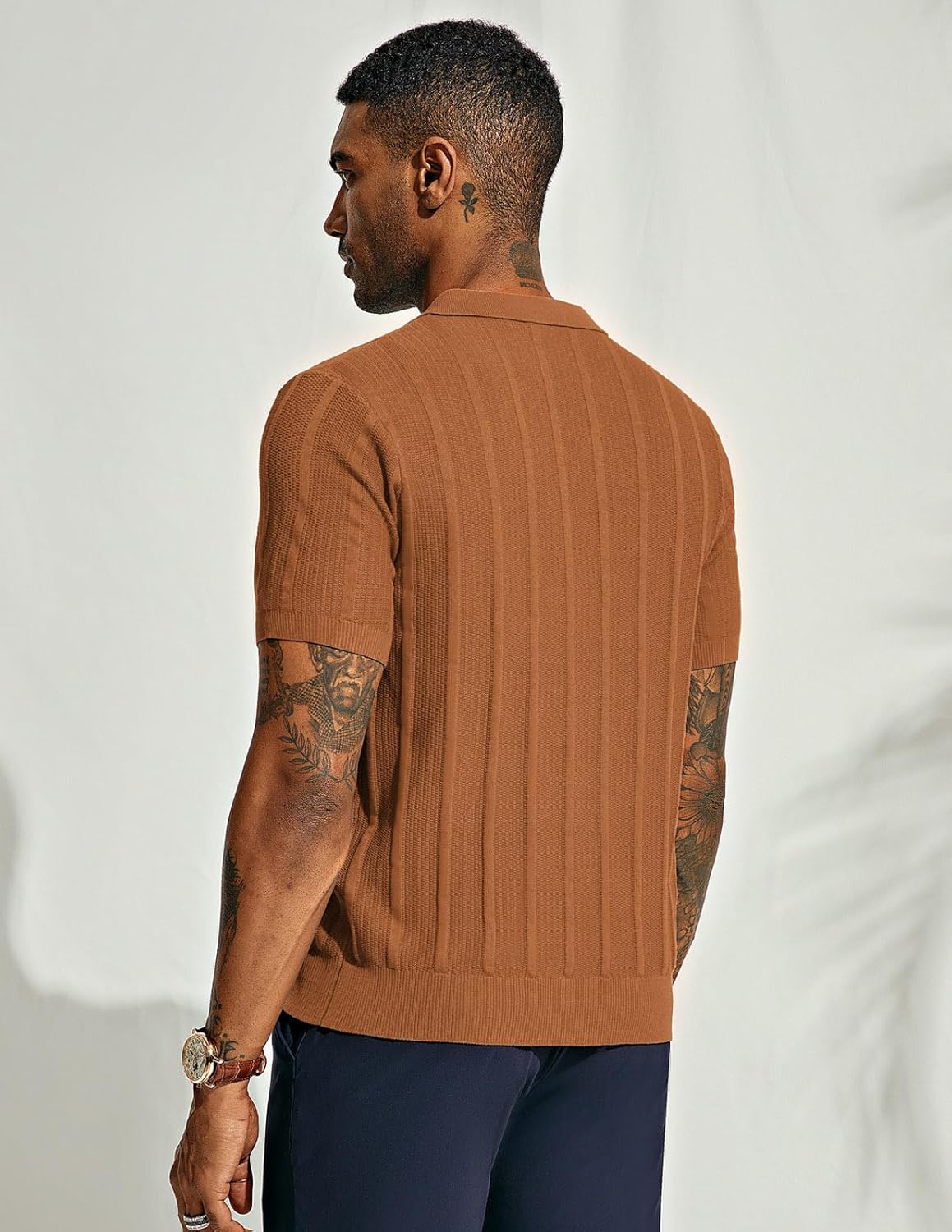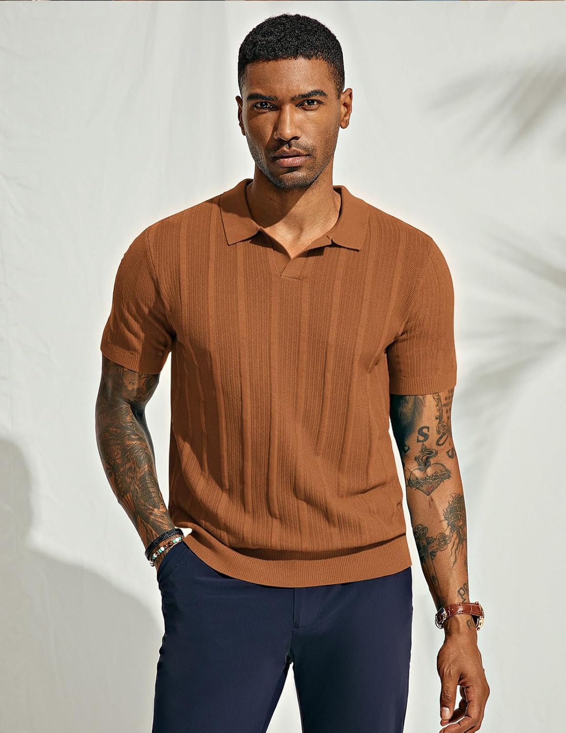 FEATURES: Knit polo shirts, v neck, textured, solid color, stretchy fabric, short sleeve, classic fit