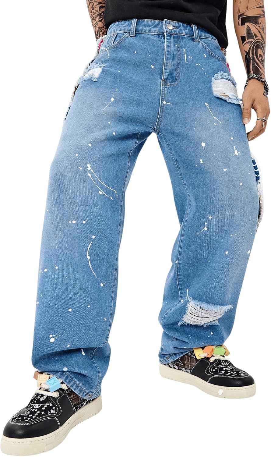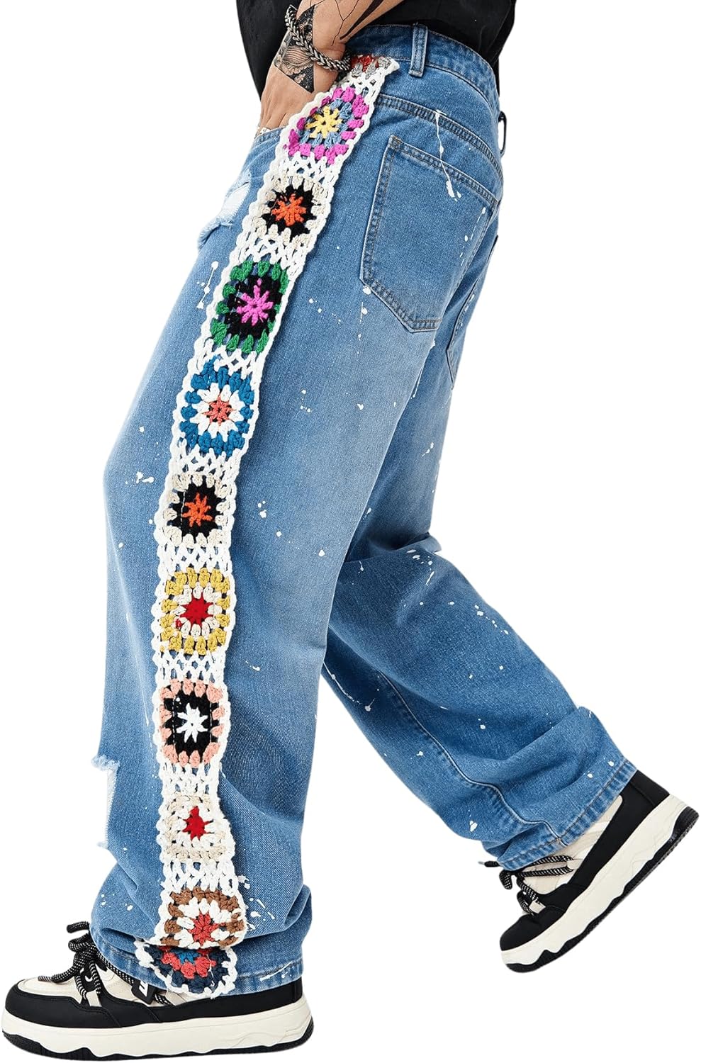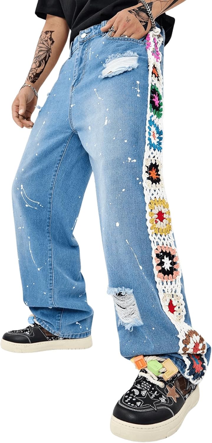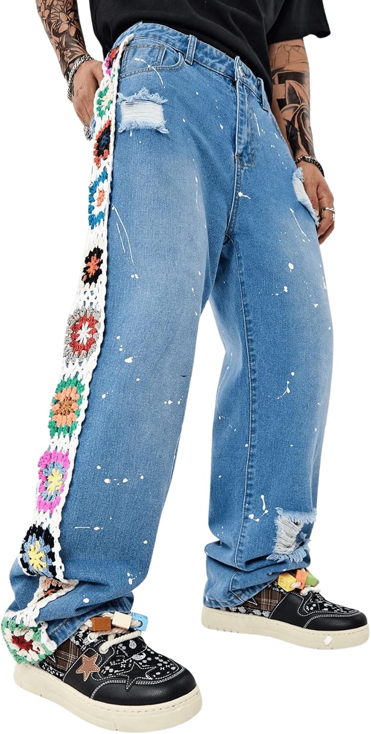 BEAUDRM Men's Floral Crochet Baggy Jeans Ripped Distressed Jeans Hip Hop Straight Leg Denim Pants Streetwear