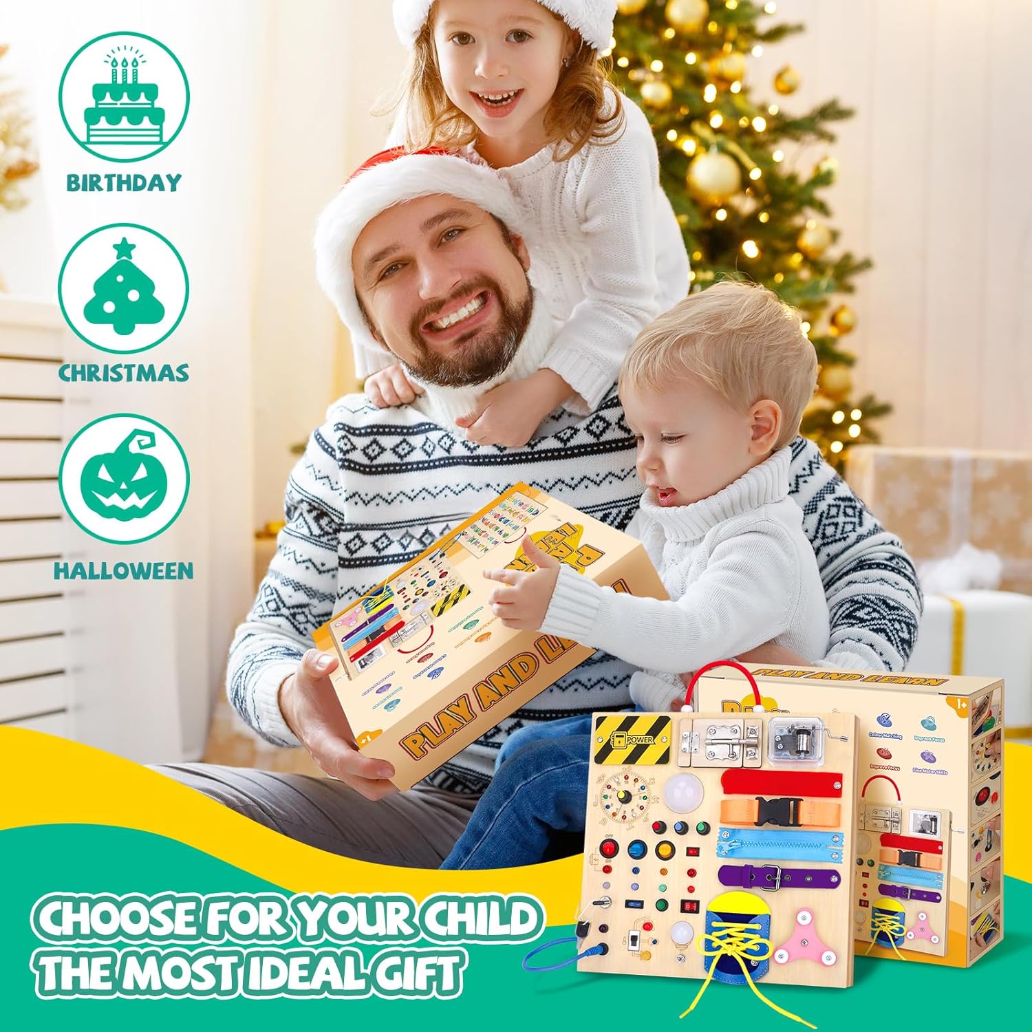 Expertly Designed - The Busy Board is a meticulously crafted sensory board specifically tailored for toddlers who enjoy toggles, LED lights, belts, music boxes, and more. With 13 independent switches and corresponding LED lights of different colors and styles, it features a master switch to easily turn off all lights to save energy.Noteworthy features are the color recognition and music box functions, providing an exceptional play and learning experience.