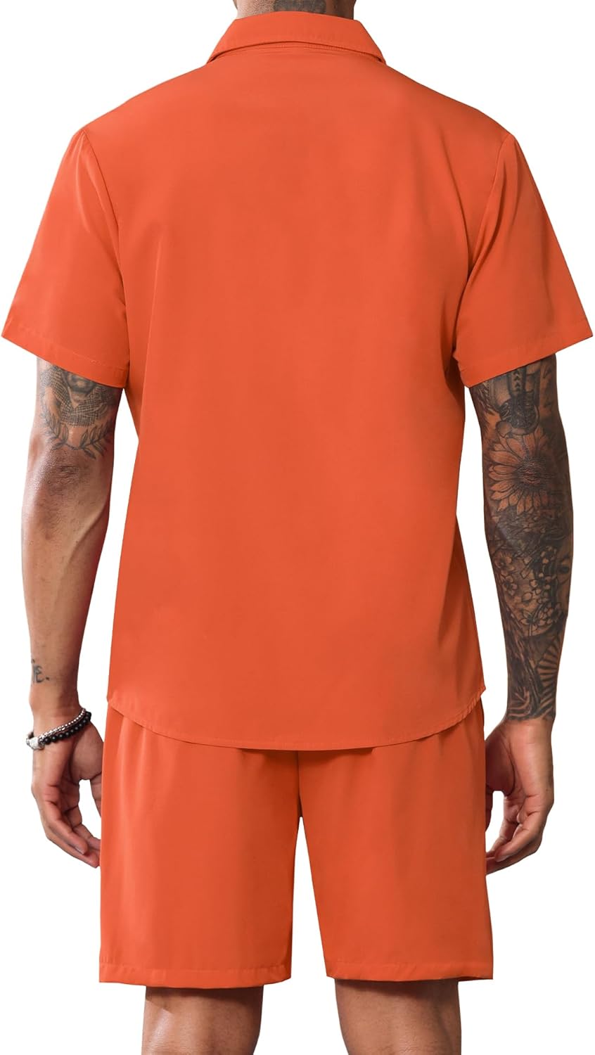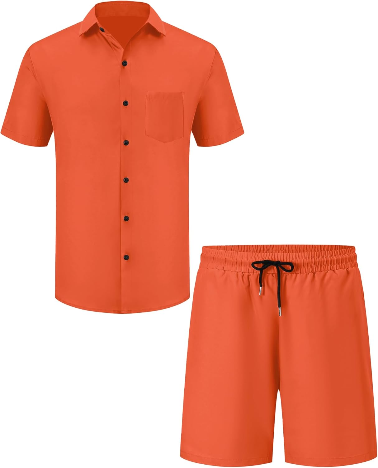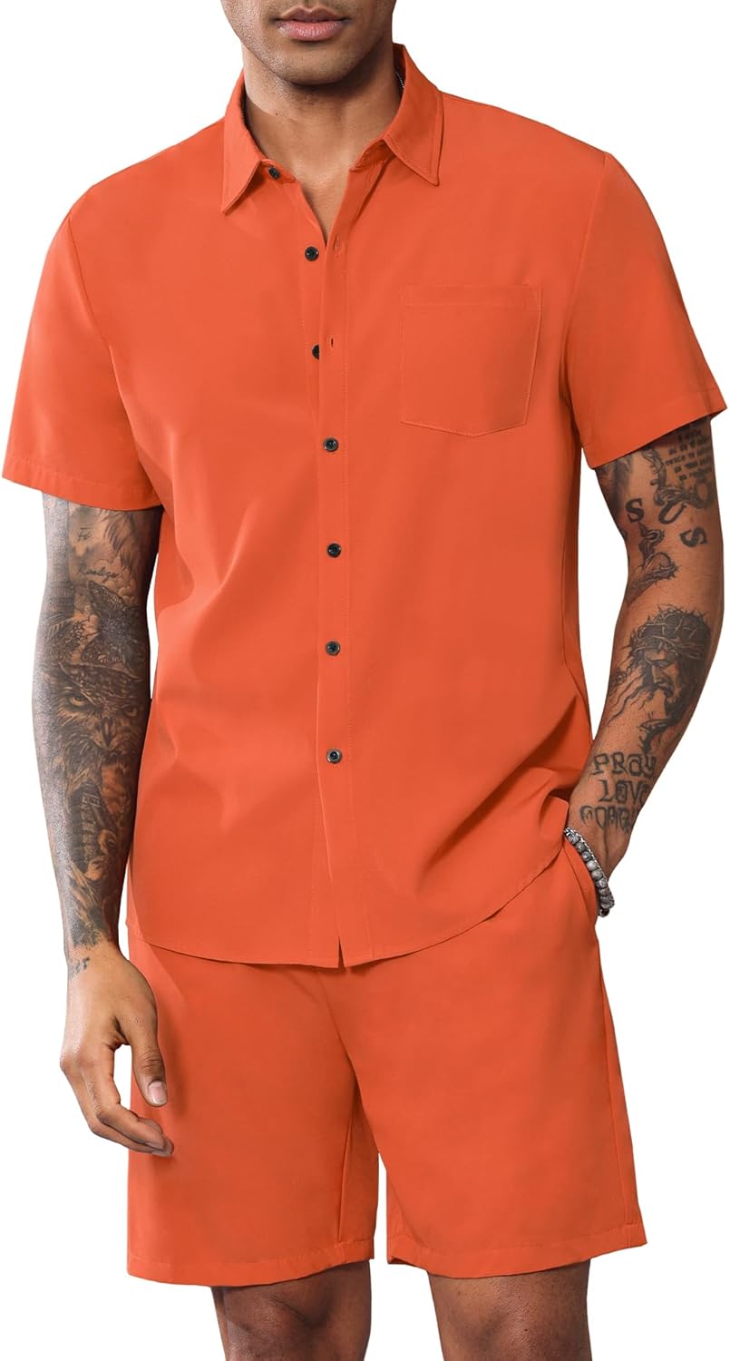 Design: Classic fashion 2 piece mens summer outfits, men tracksuit 2 piece set, men solid button shirt & shorts, regular fit, plain color shirts tops, button down closure, one chest pocket, short sleeve and high-rise elastic waistband shorts, side pockets, basic solid plain color, adjustable waist drawstring. A must-have summer outfit sets in your wardrobe!