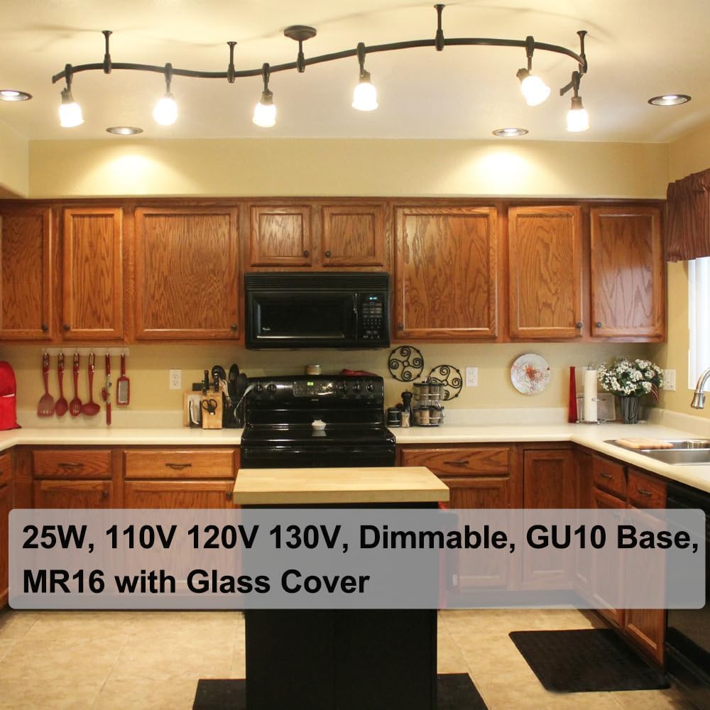 1,【Long Lasting Lifetime】: 6 pack mr16 gu10 halogen, made of high-quality tungsten filaments, enjoy 3000 hours long lasting life, these gu10+c 120v 25w can switch on and off about 8000 times, saving you the cost of frequent bulb replacement.